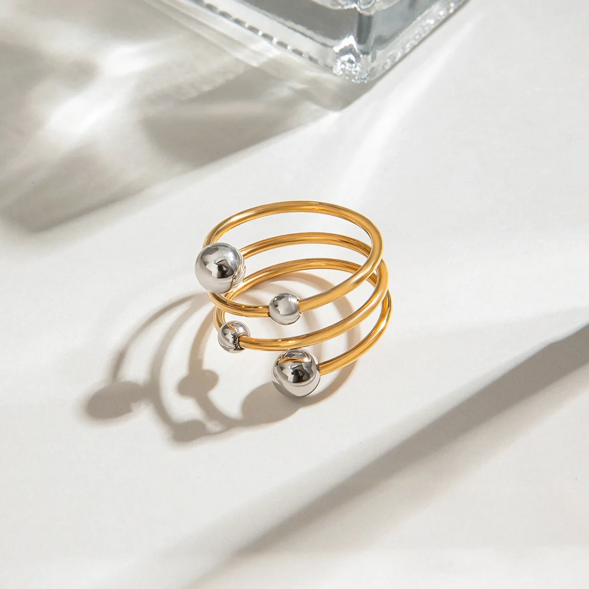 MW Women's Personality Geometric Ring - Silver & Gold-Plated, Multi-Layer, Two-Tone Stainless Steel with Round Ball Design