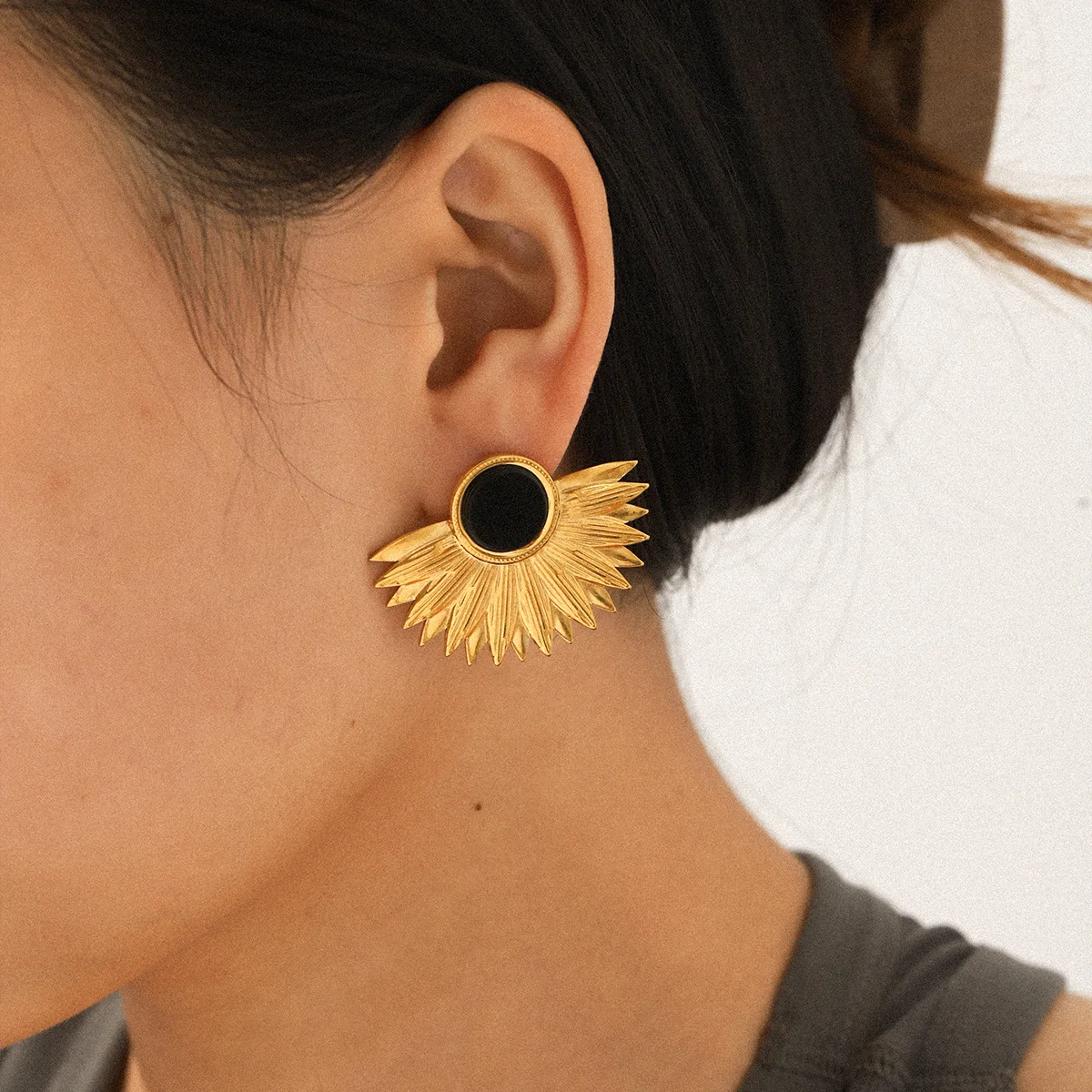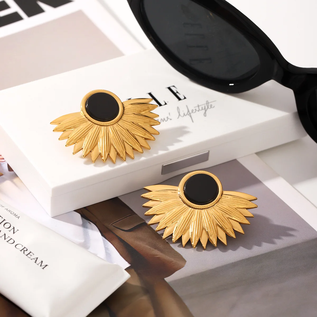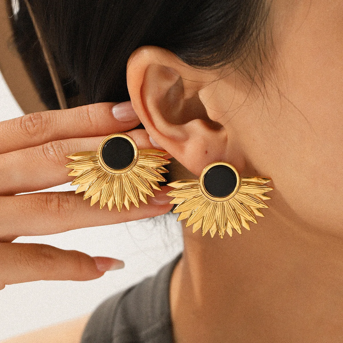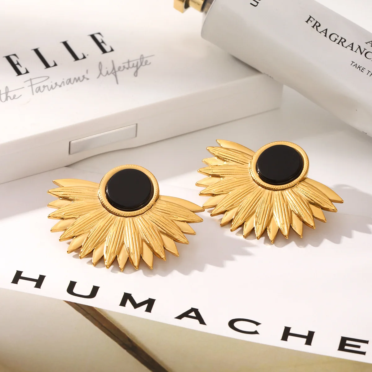 MW Vintage Fan Tiger Eye Earring 18K Gold Plated Stainless Steel Black Agate Stainless Steel Stud Earrings for Women Jewelry