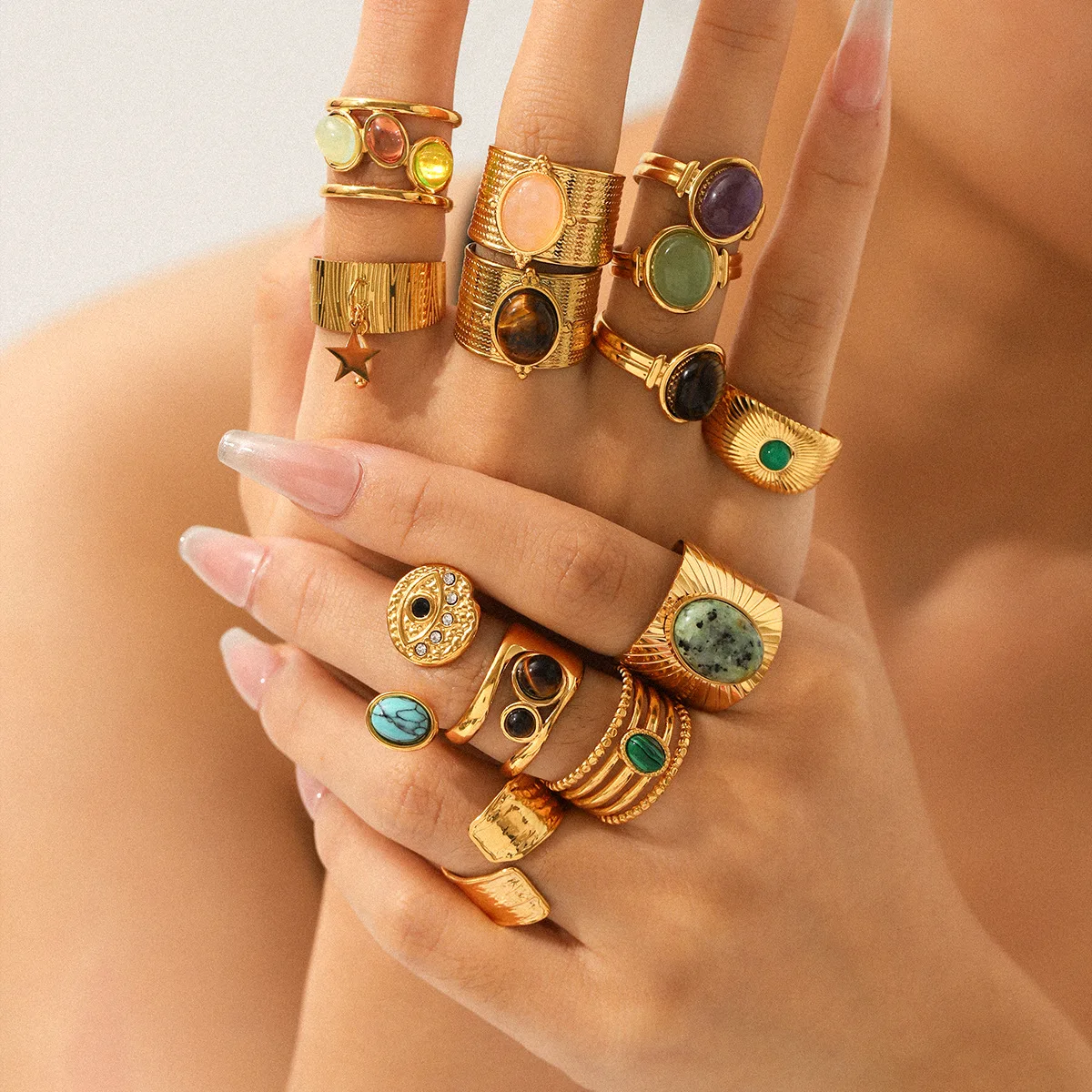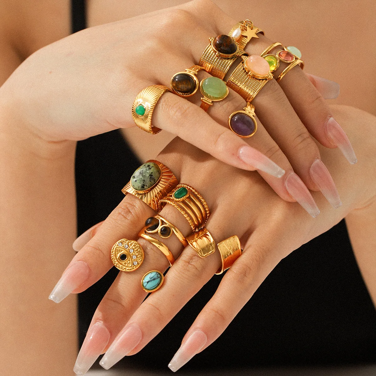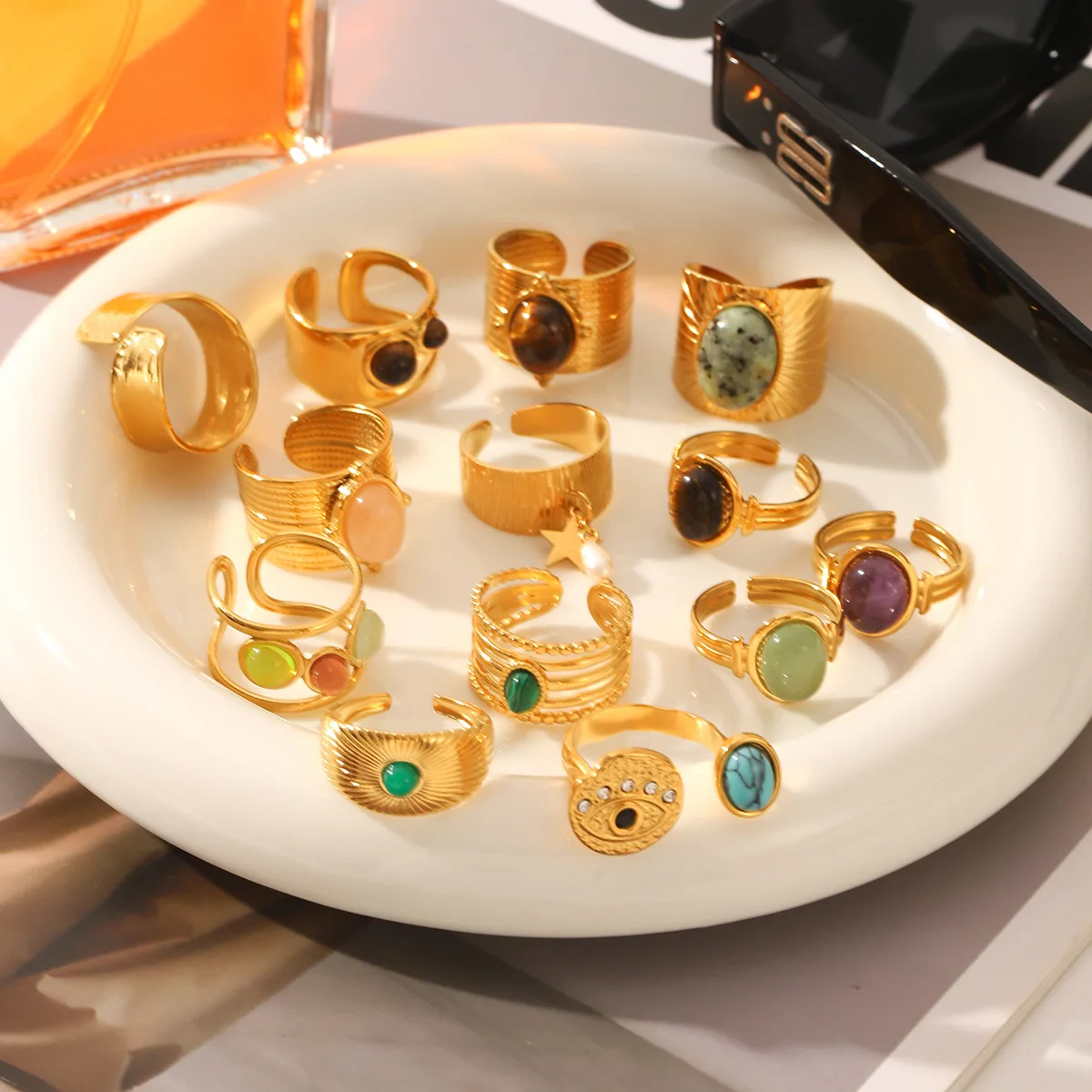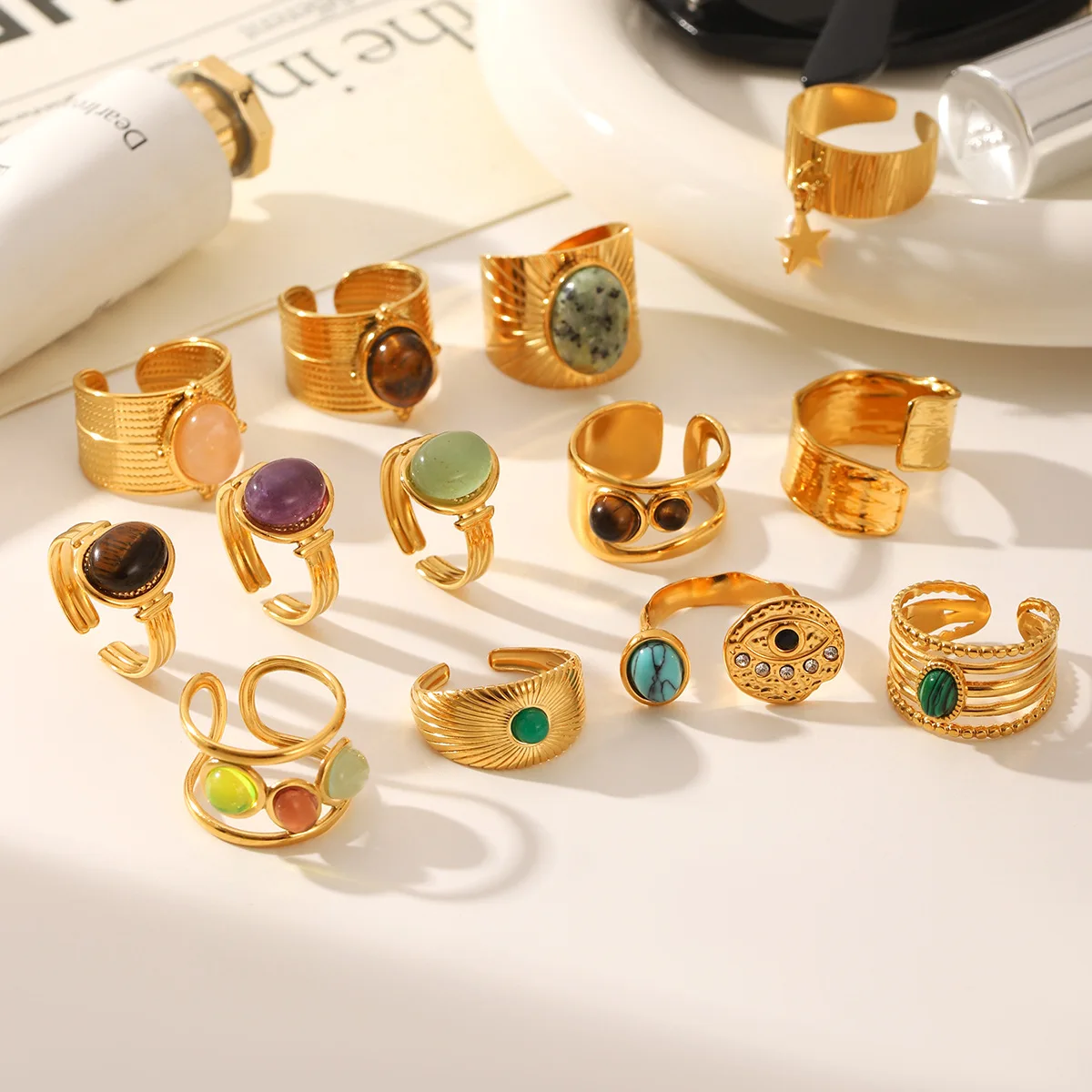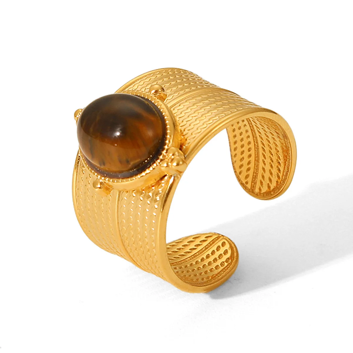 MW Natural Stone Stainless Steel 18K Gold Plated Pearl Tiger Eye Stone Water Drop Shape Open Rings Women's Stainless Steel Ring