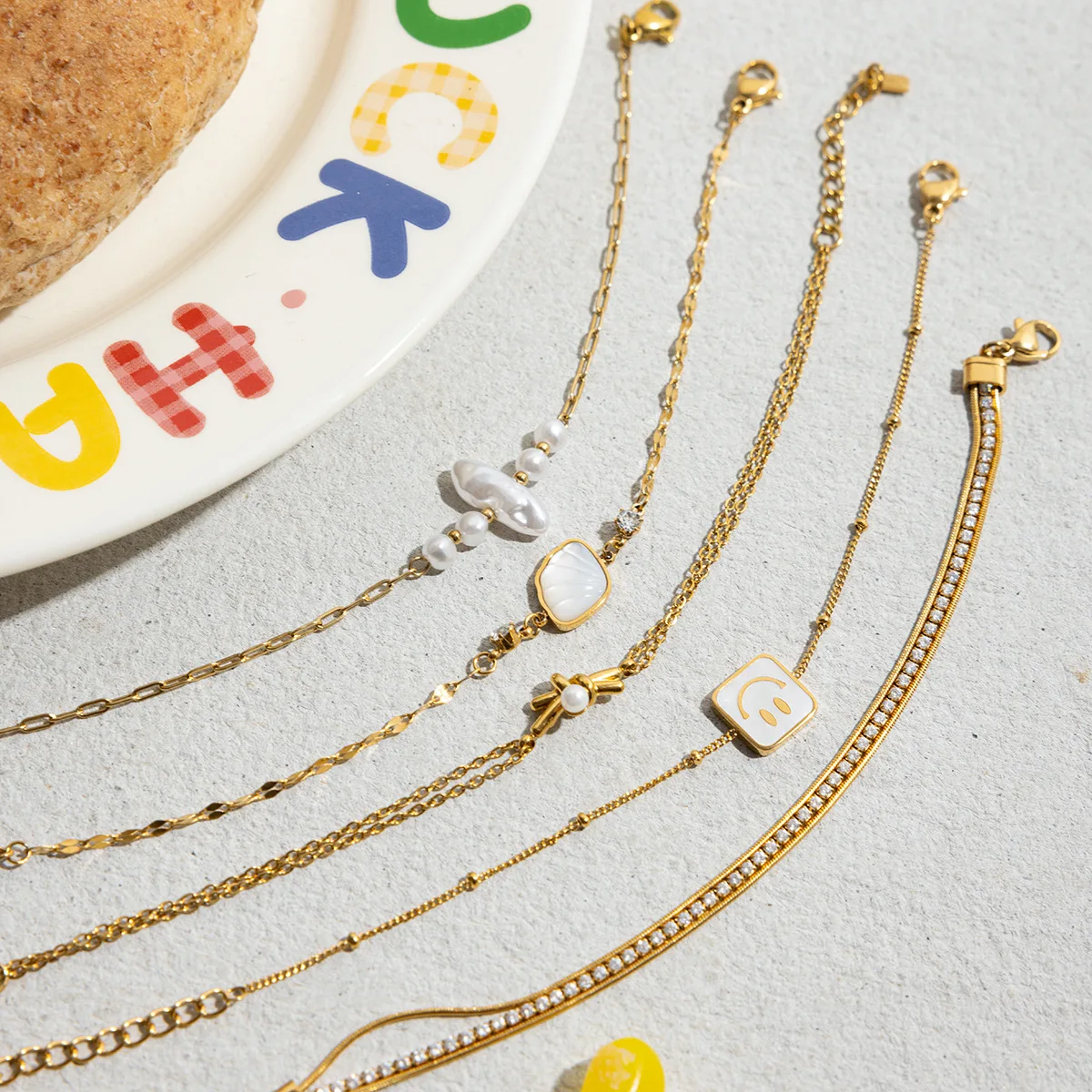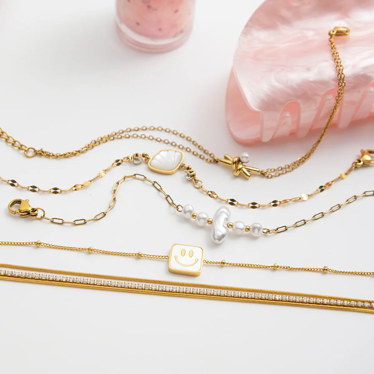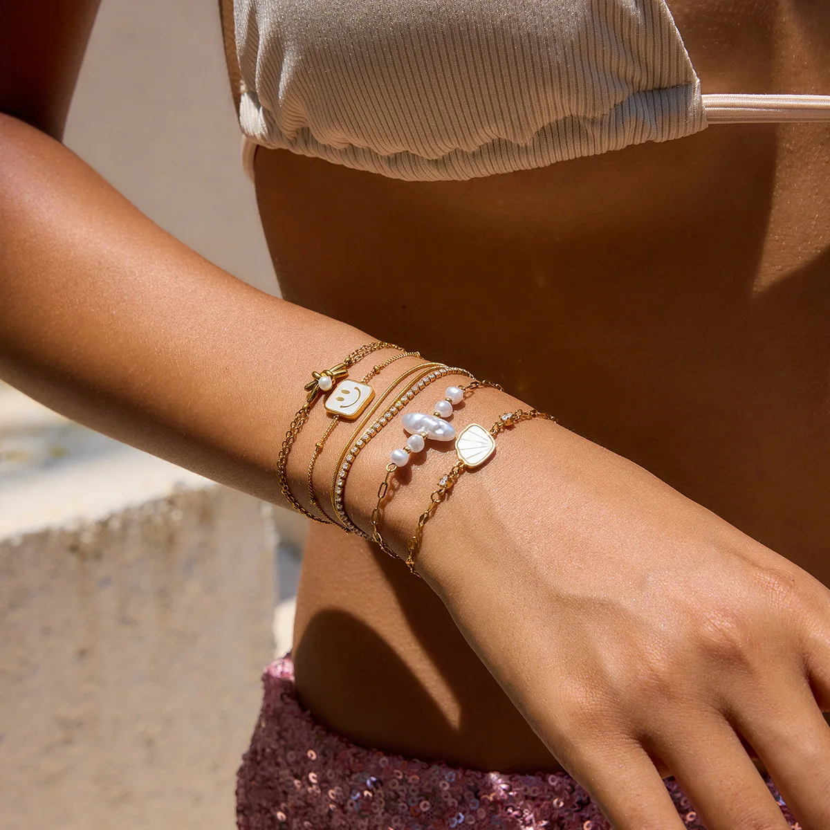MW Summer Ocean 18K Gold Stainless Steel Three-Layer Zircon Shell Glass Pearl Face Bracelets Set