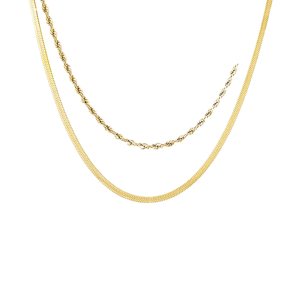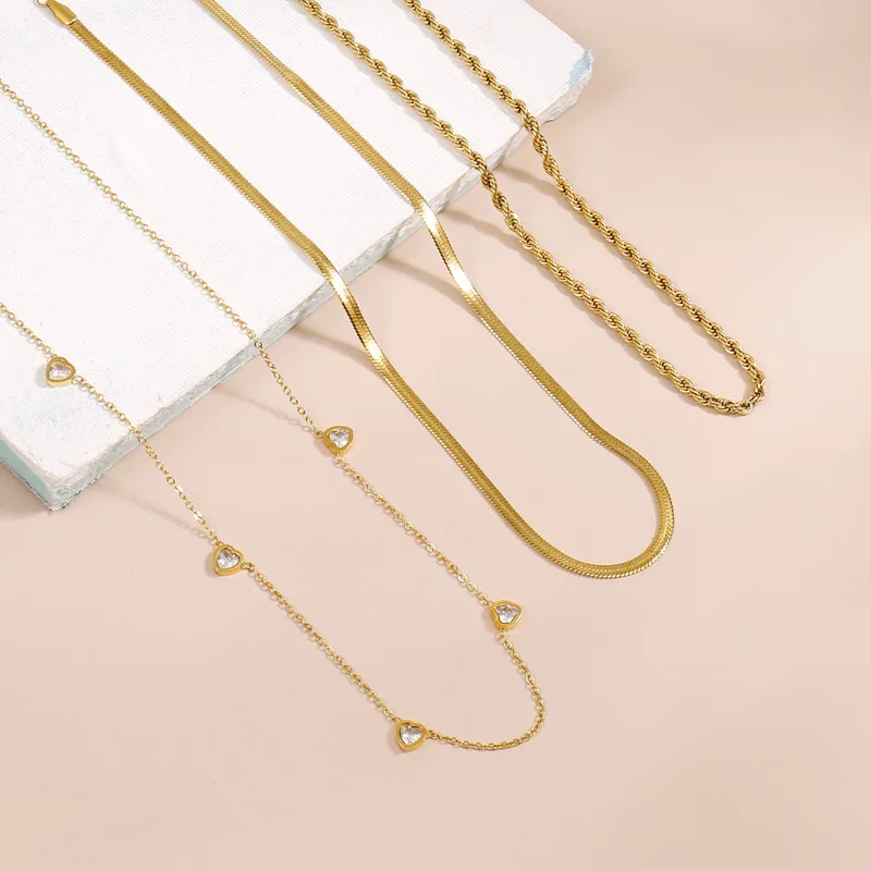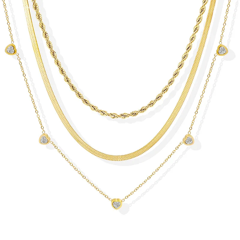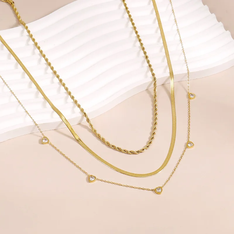 MW Luxury 18K Gold Stainless Steel Necklaces Snake Chain Stackable Three-layer Heart-Shaped CZ Zirconia Charm Layered Necklace