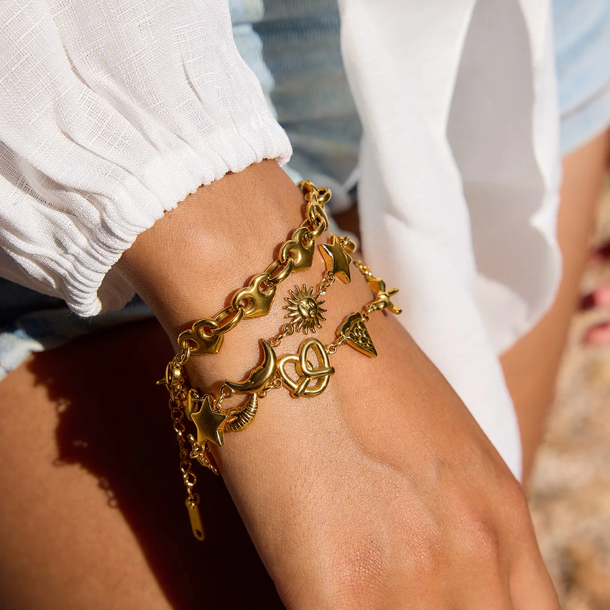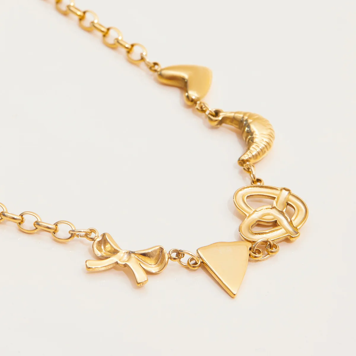 MW 18K Gold-Plated Stainless Steel Waterproof Bracelet with Sweet Romantic Heart, Croissant, Pizza and Bow Designs