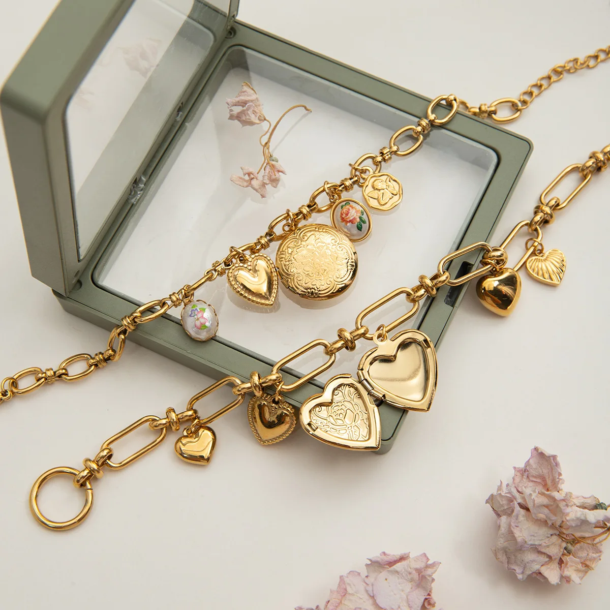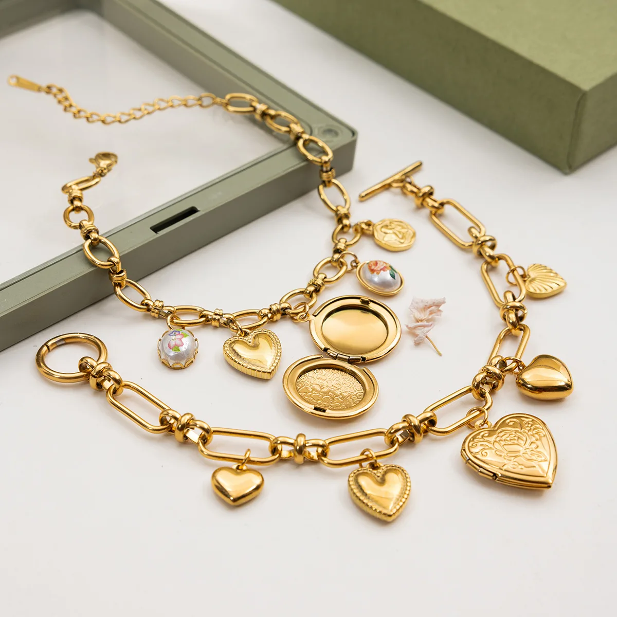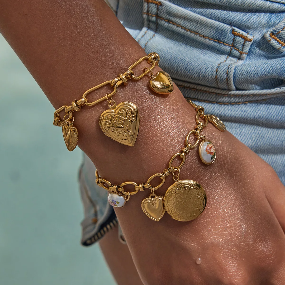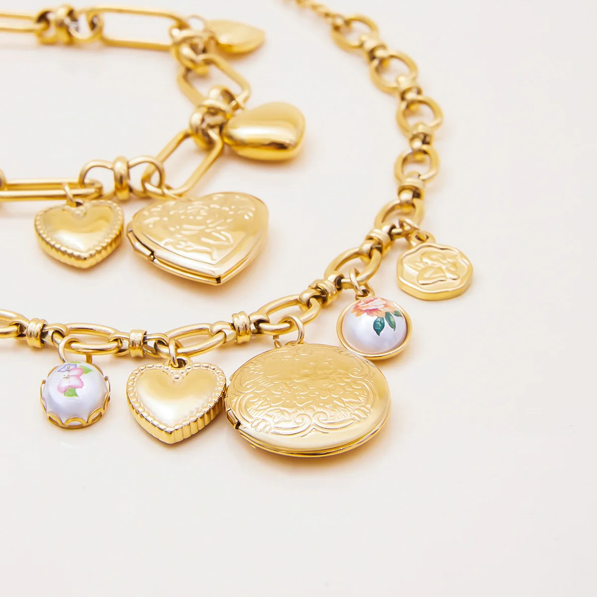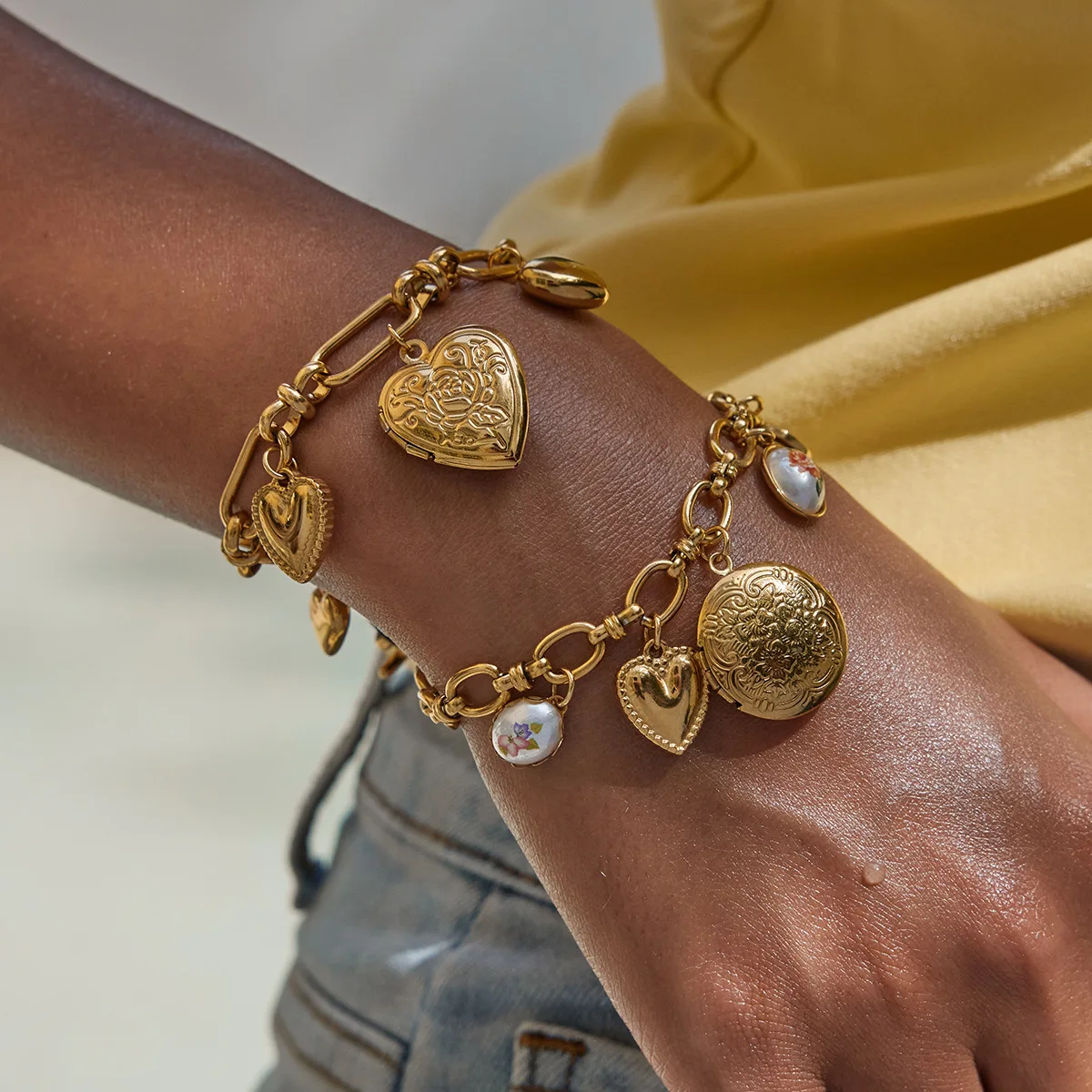 MW Trendy Sweet Romantic Charm Bracelet Stainless Steel with Pearl Accents, Photo Locket, Angel & Love Heart OT Clasp Design