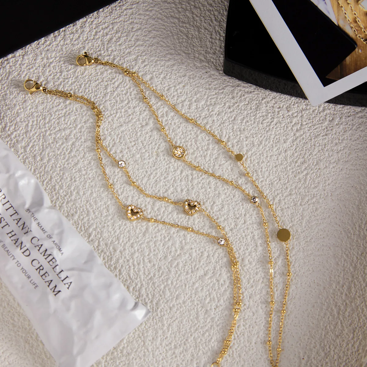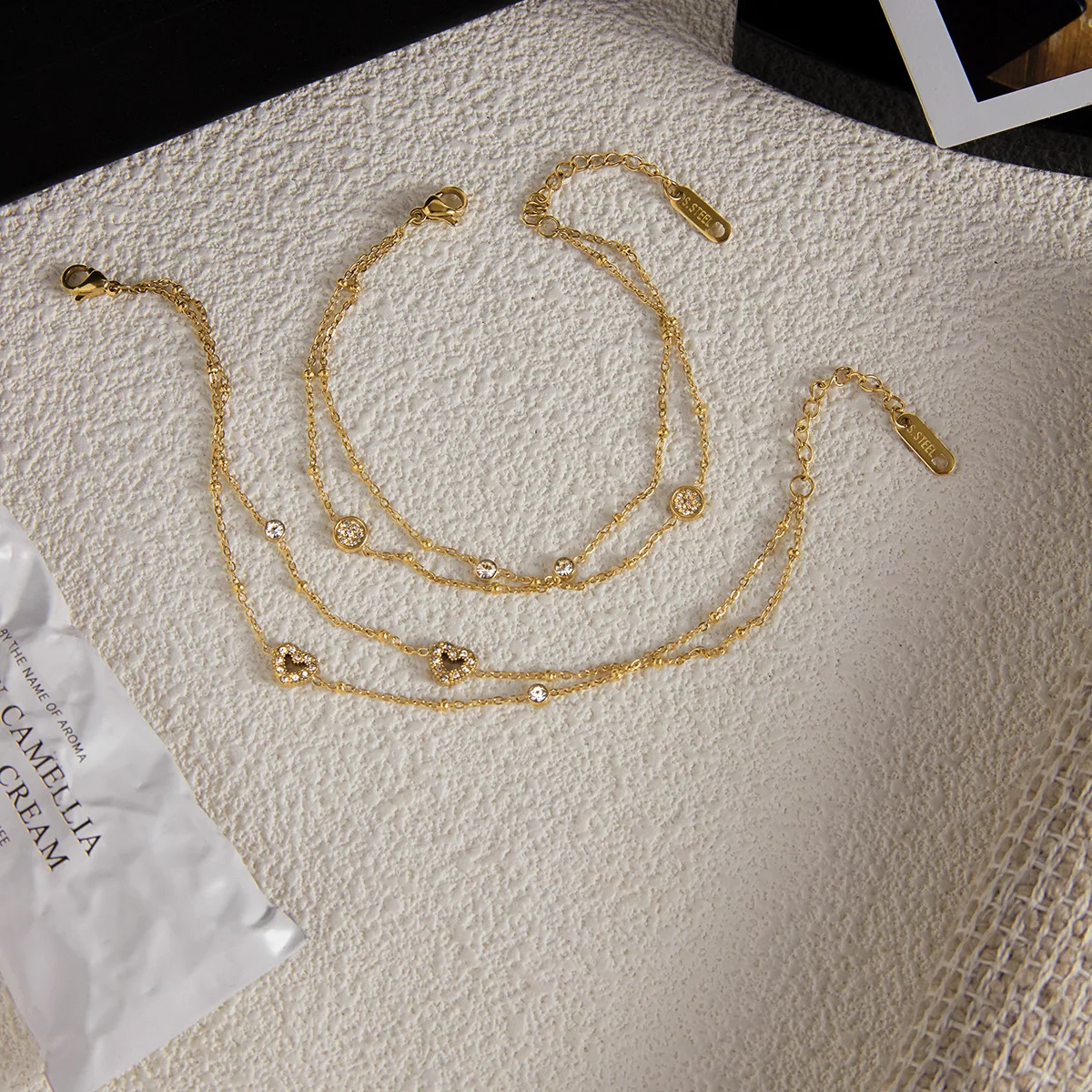 MW Elegant 18K Gold-Plated Stainless Steel Double-Layer Bracelet: Heart Design with Rhinestones & Turquoise Beads