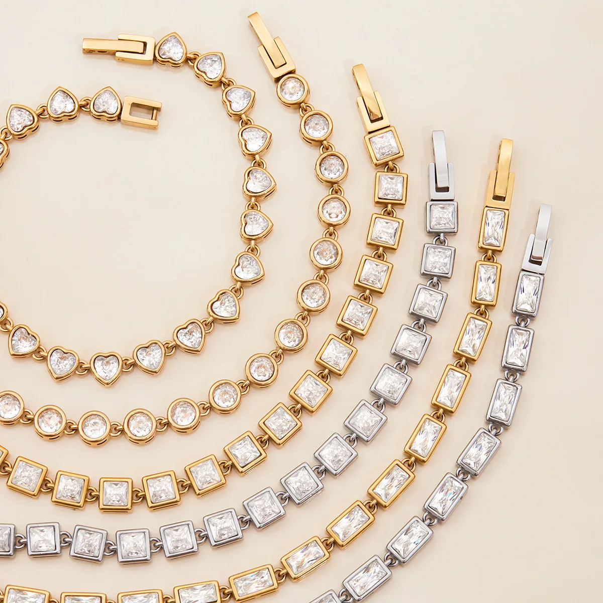 MW Stainless Steel 18K Gold-Plated Women's Tennis Bracelet Set Minimalist Geometric Design White Zircons Stackable Chain Link