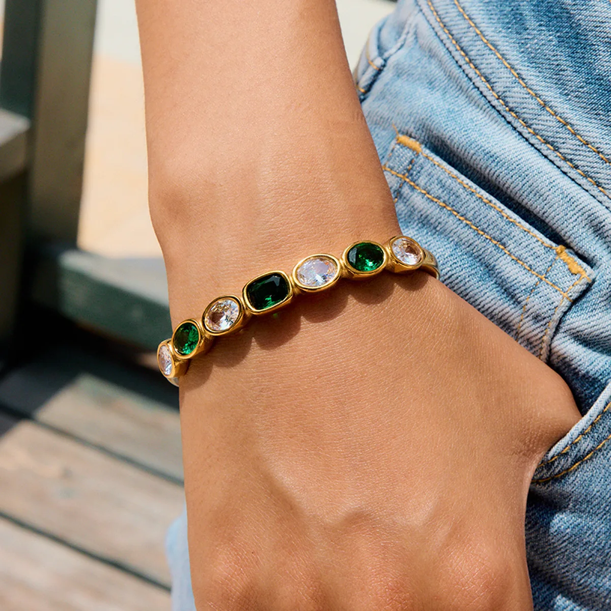 MW Women's 18K Gold-Plated Stainless Steel Bangle Waterproof Luxury Open Design with Trendy White/Green Zircons Gift