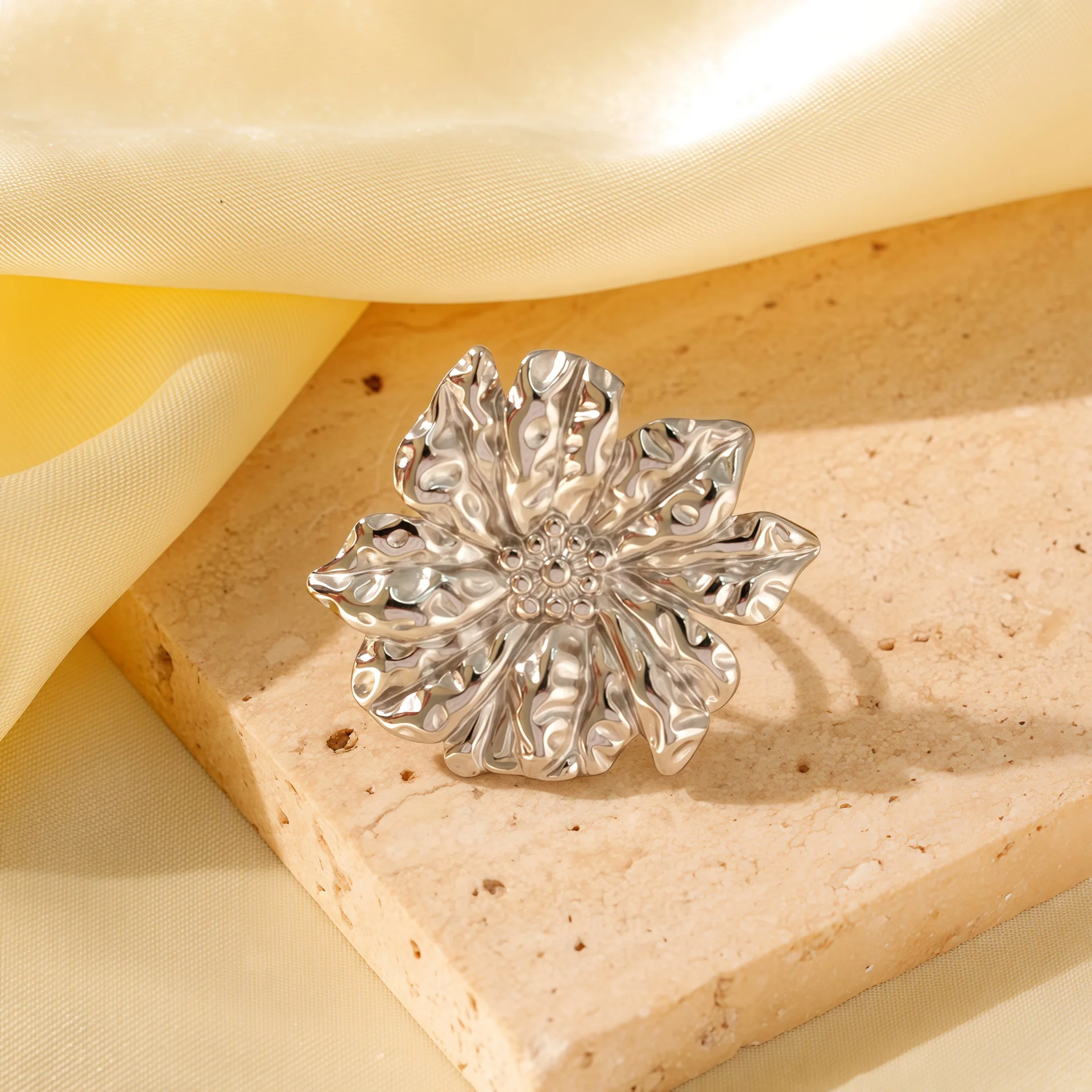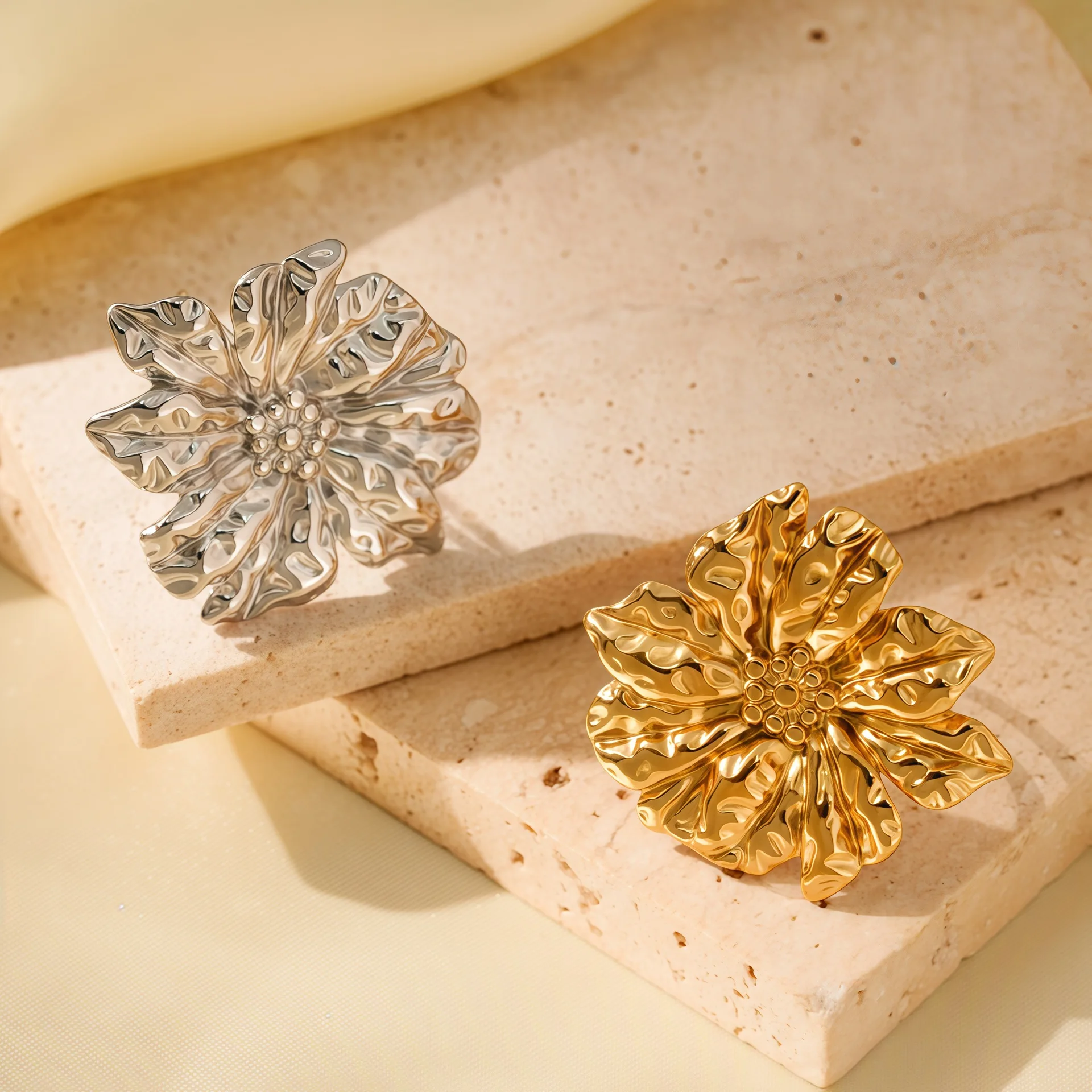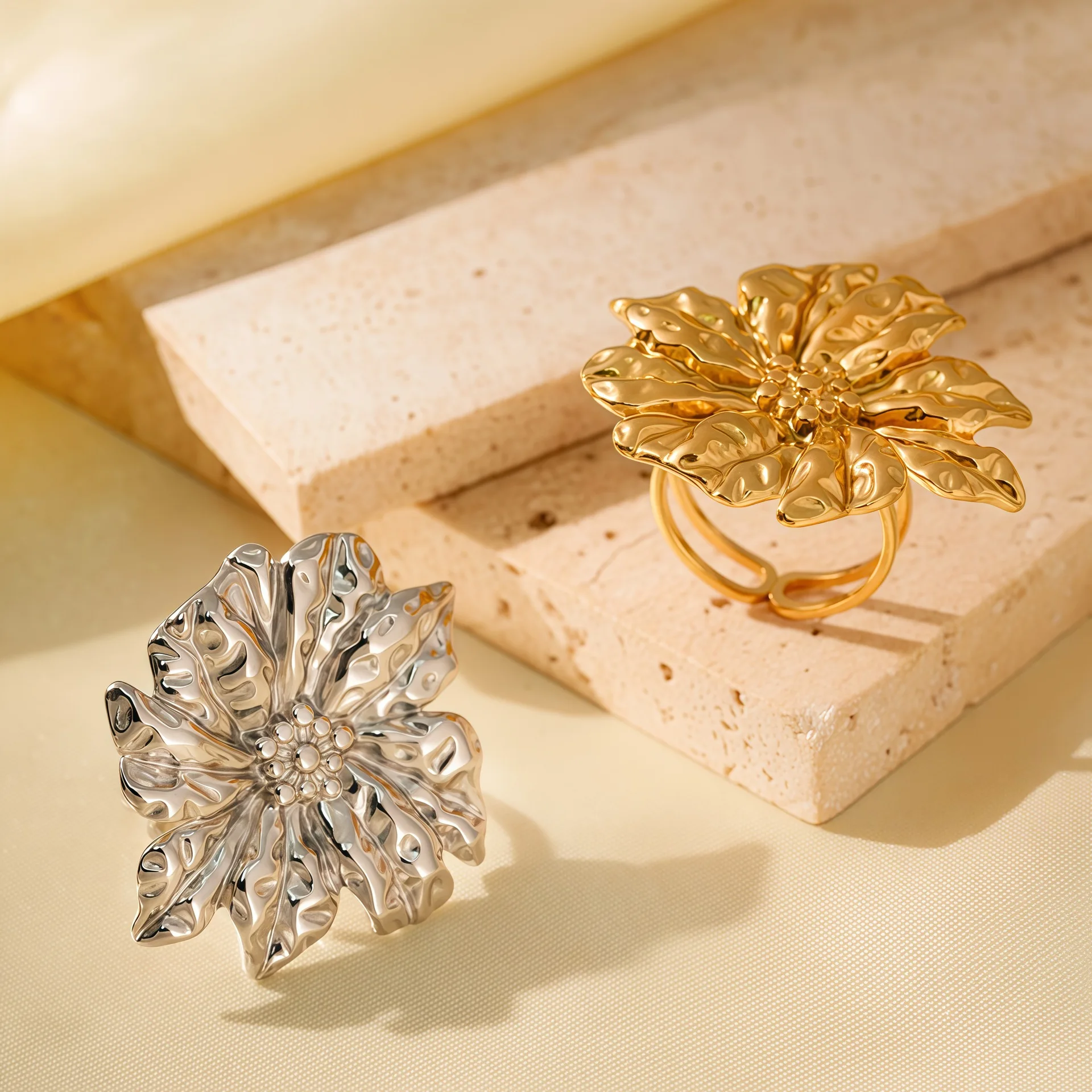 MW Retro 18K Gold Plated Stainless Steel Exaggerated Flowers Ring Waterproof Engagement/Party/Gift Jewelry for Women