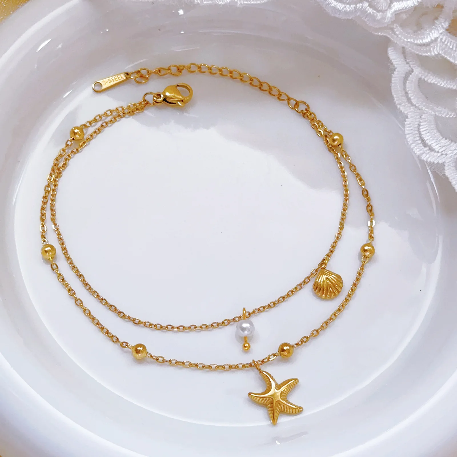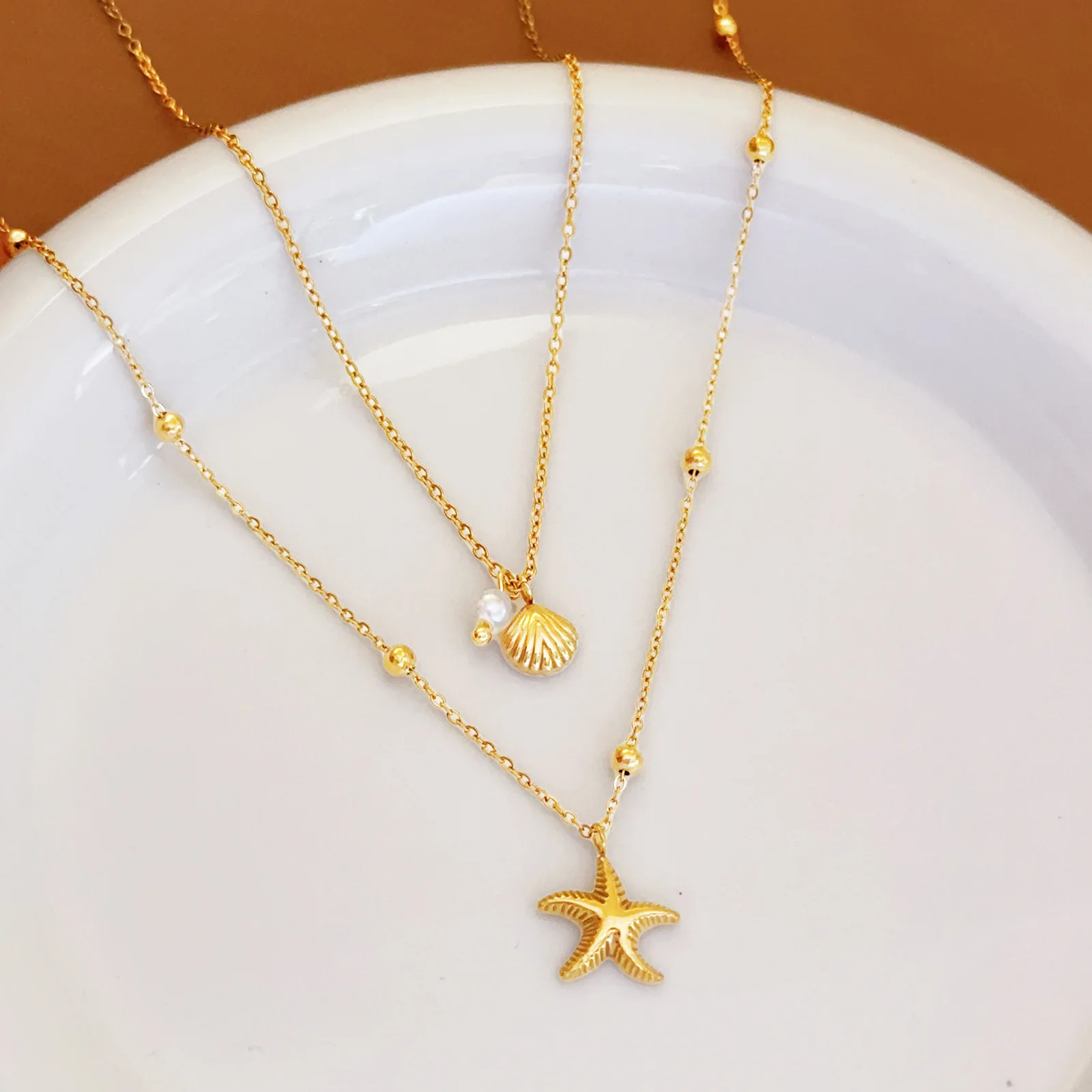 MW 18K Gold-Plated Stainless Steel Necklace: Trendy Double-Layer Pendant Style with Shell & Seastar Summer Holiday Gift