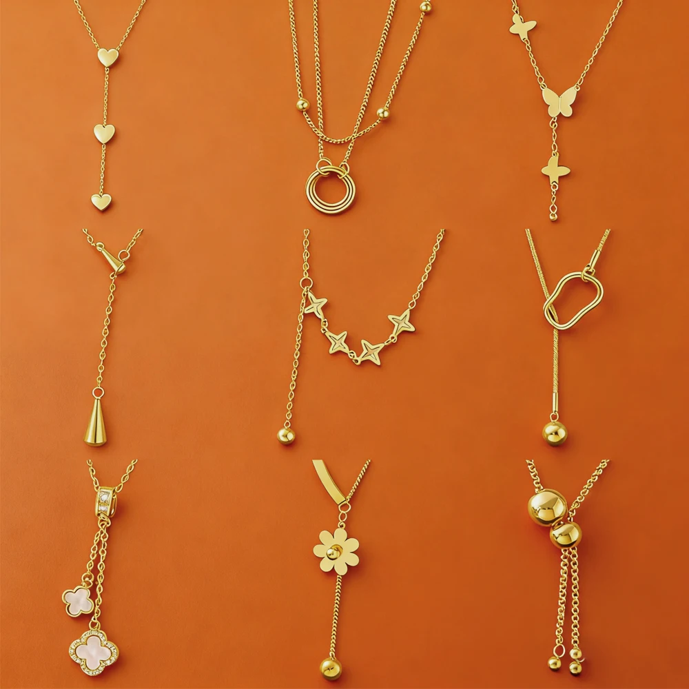 MW Indian 18 Non Tarnish Gold Plated Jewelry 316l Pull-out Long Pendant Round Ball Butterfly Stainless Steel Necklace Jewelry