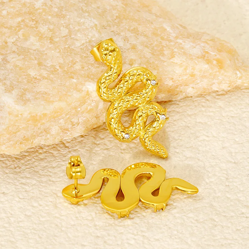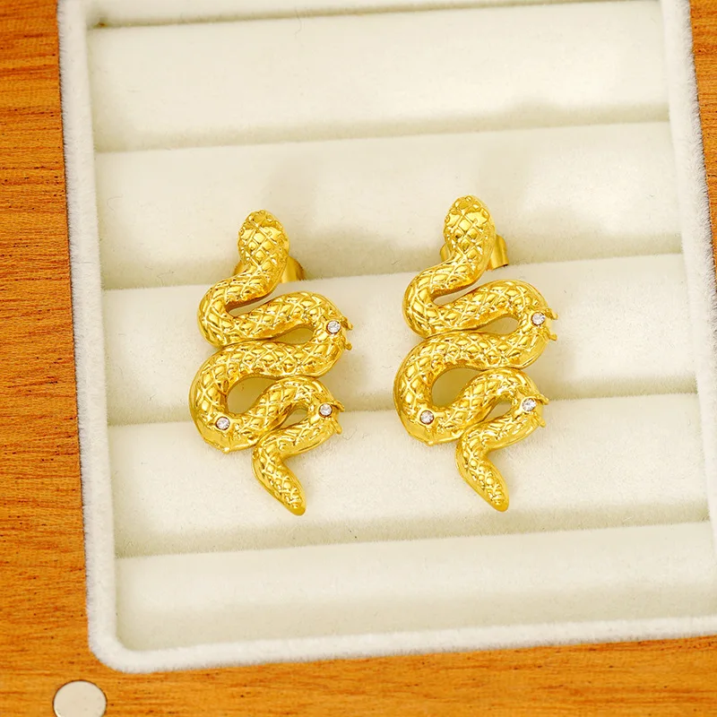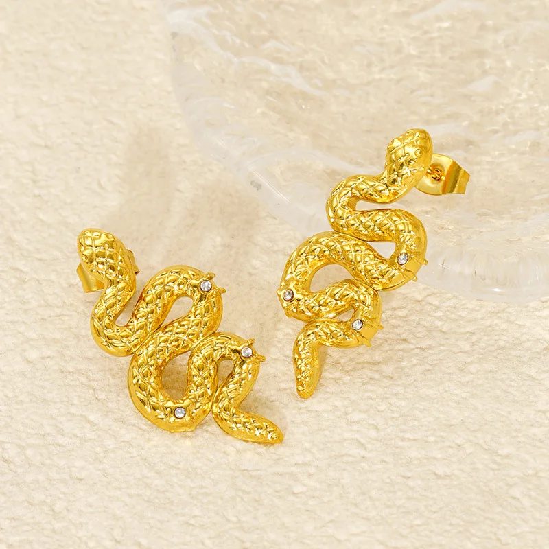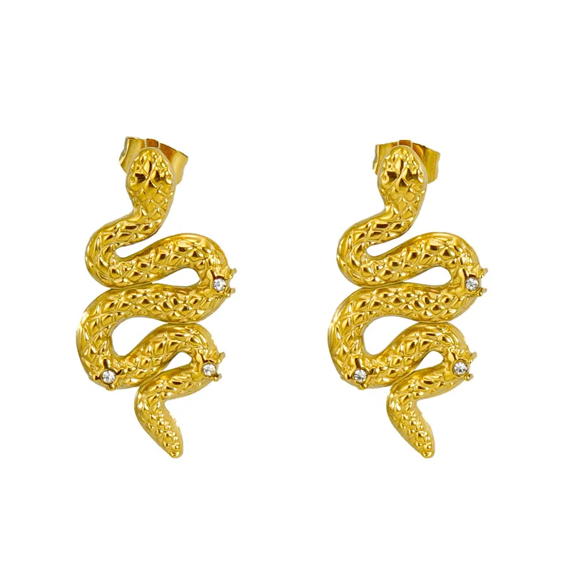 Premium Stainless Steel Drop Earrings: Gold-Plated Snake & Oriental Dragon Design with Diamond Eyes & Zircon Stones