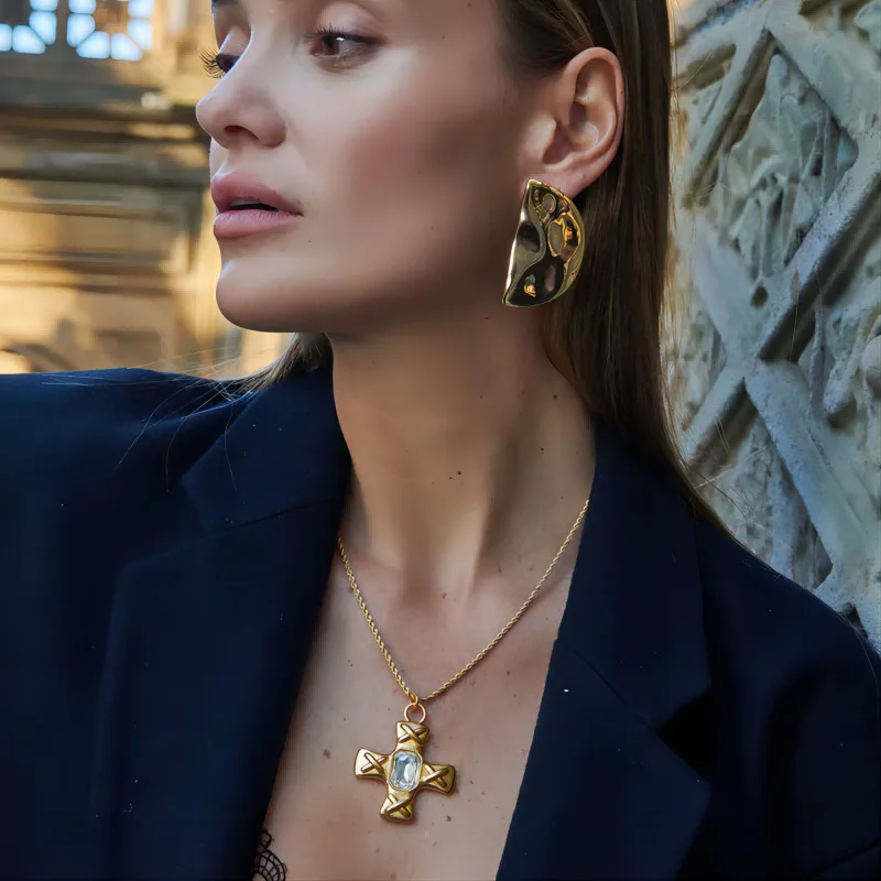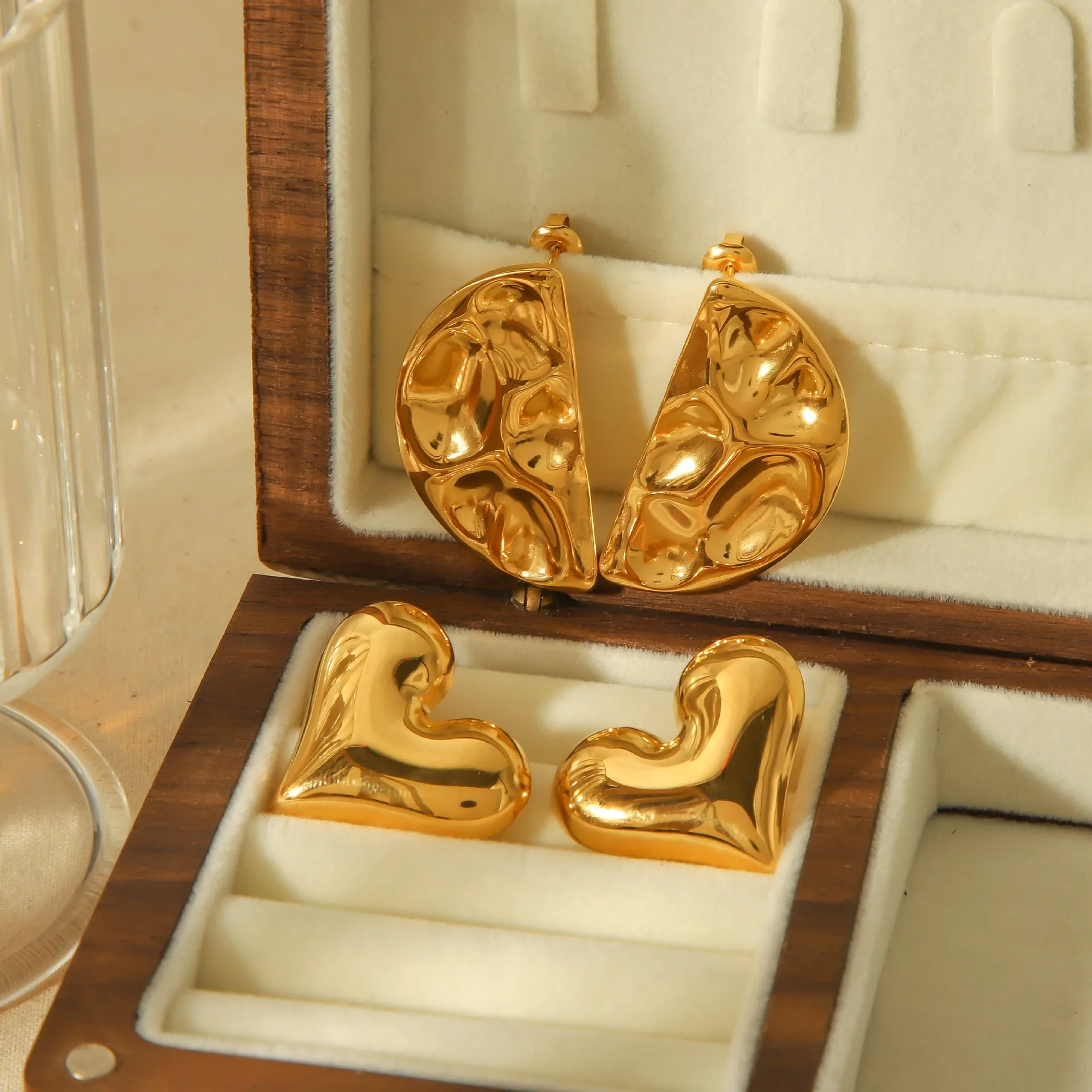 MW Waterproof Stainless Steel Stud Earrings for Girls: PVD Gold Dipped, Half-Circled Hammered Texture Statement Jewelry