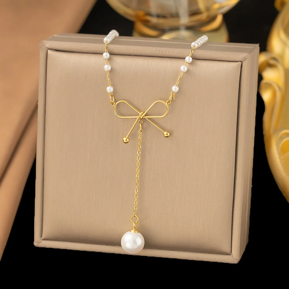 MW Custom 316l Stainless Steel Choker Square Zircon Stone Bow Pearl White Shell Crystal Pendant Locket Long Necklaces for Women