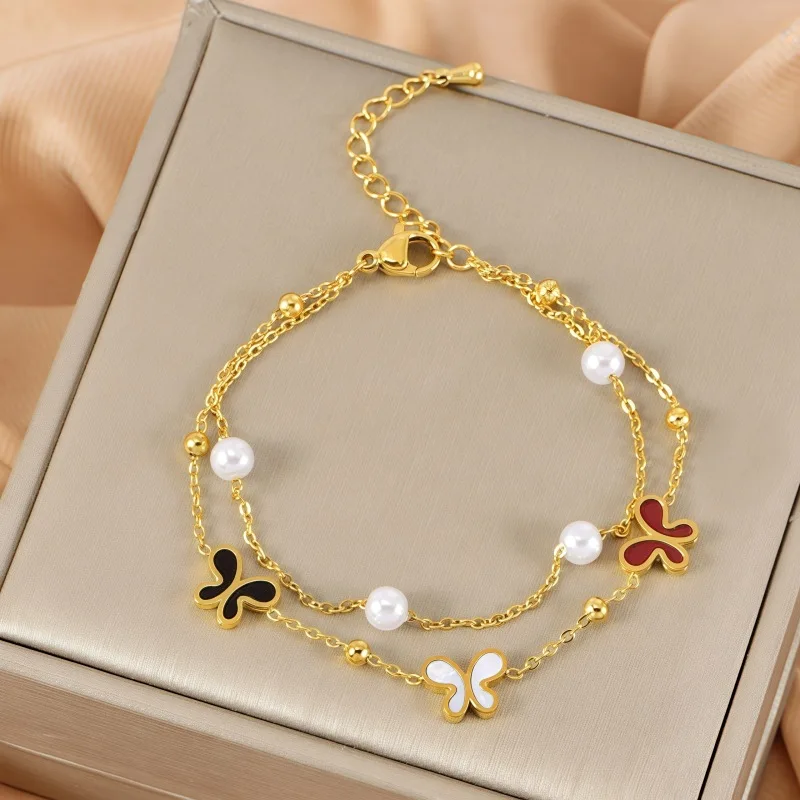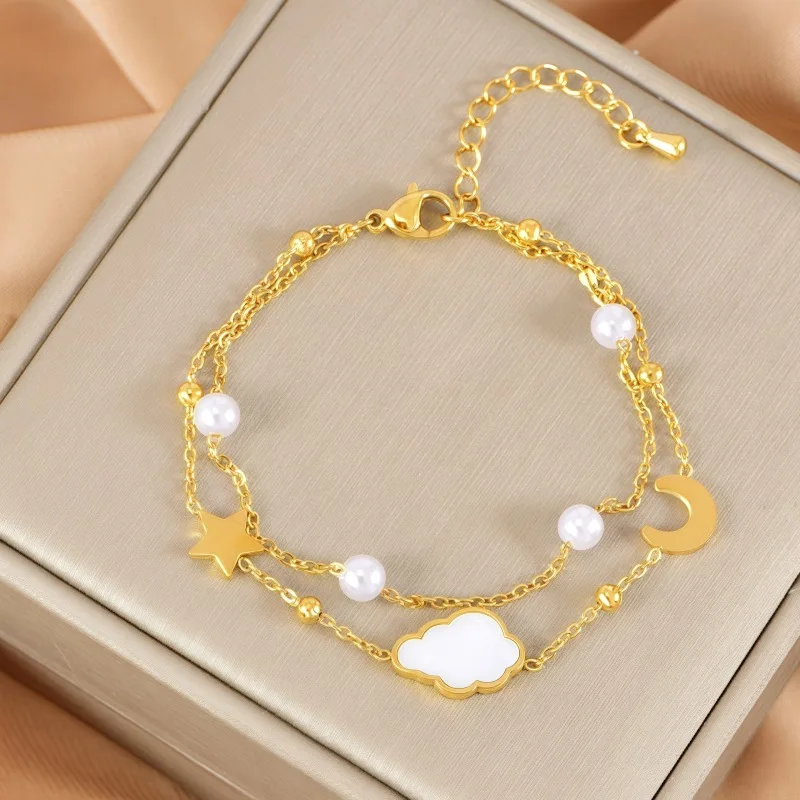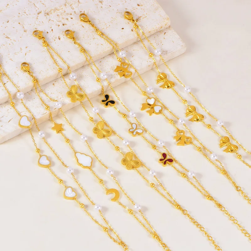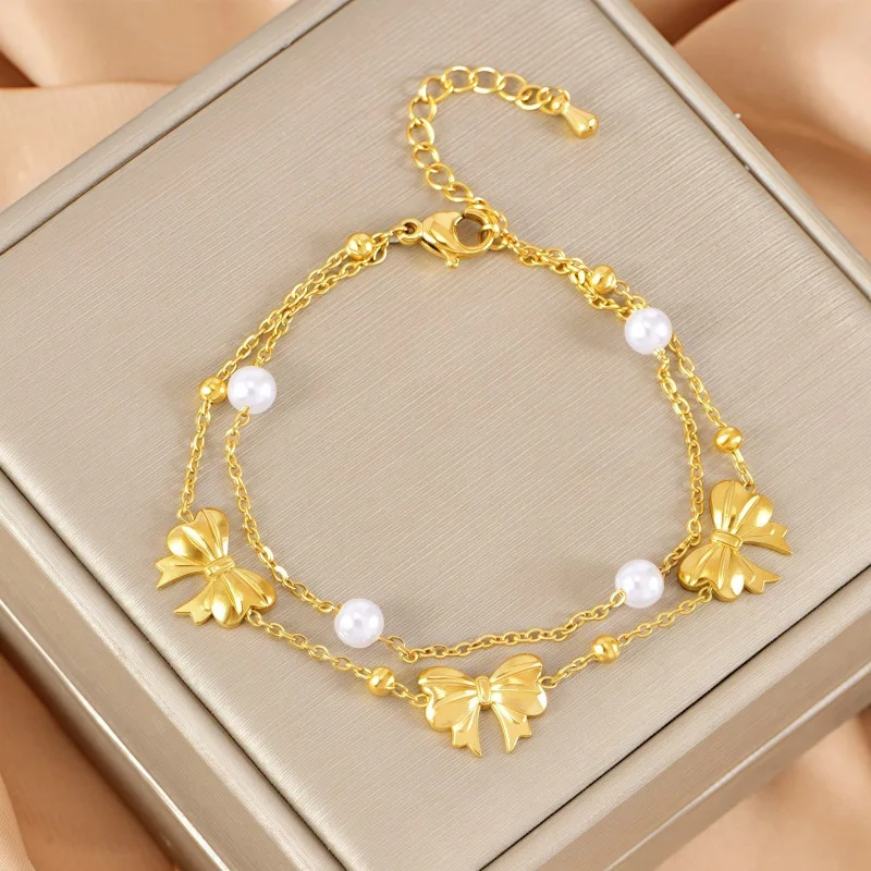 MW Women's Fashionable Pearl 18K GoldPlated Stainless Steel Double-Layer Bracelet with Shell Bowknot & Double-Sided Heart Charms
