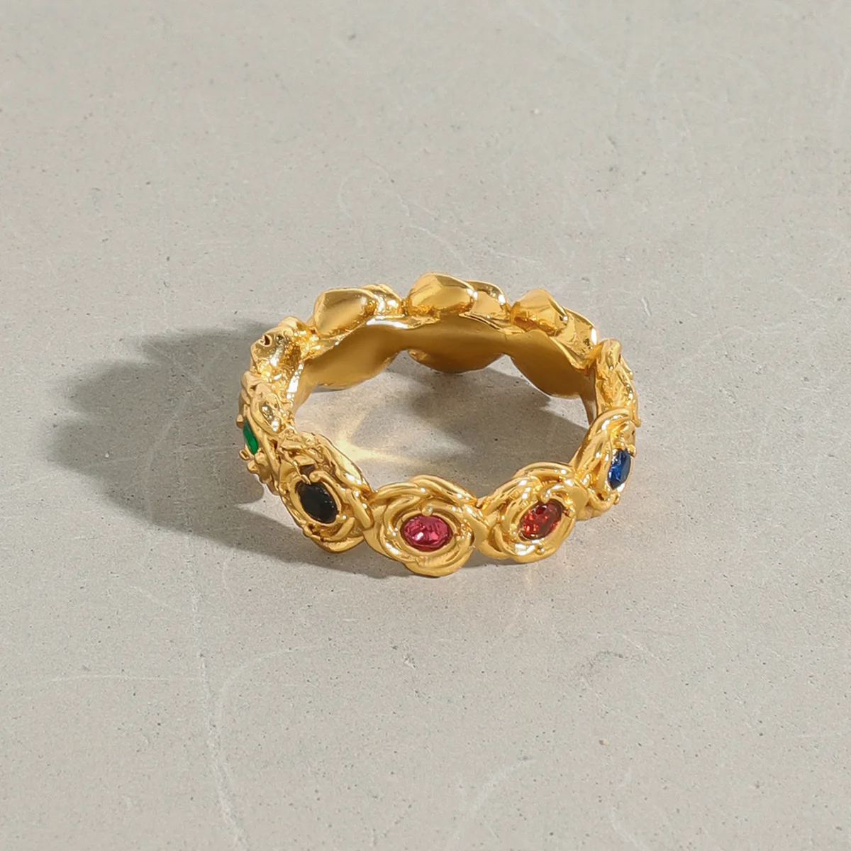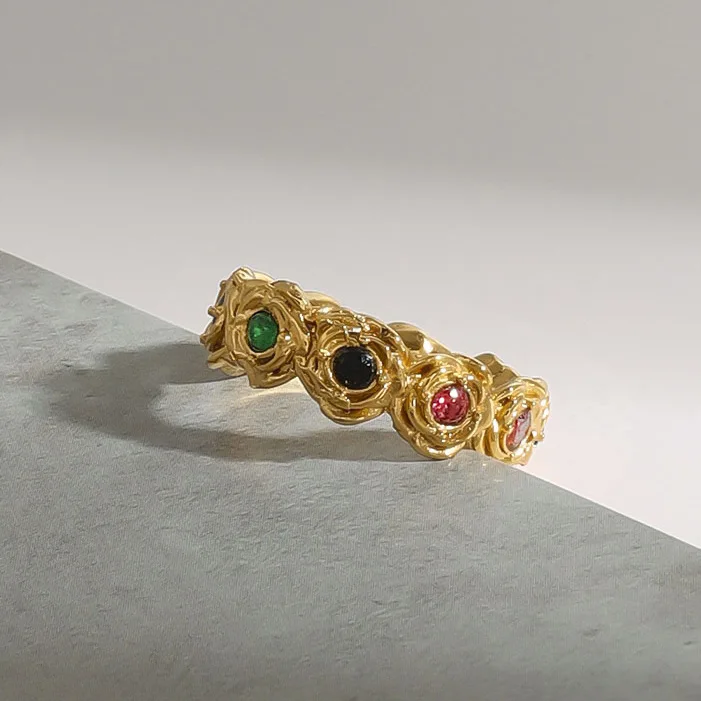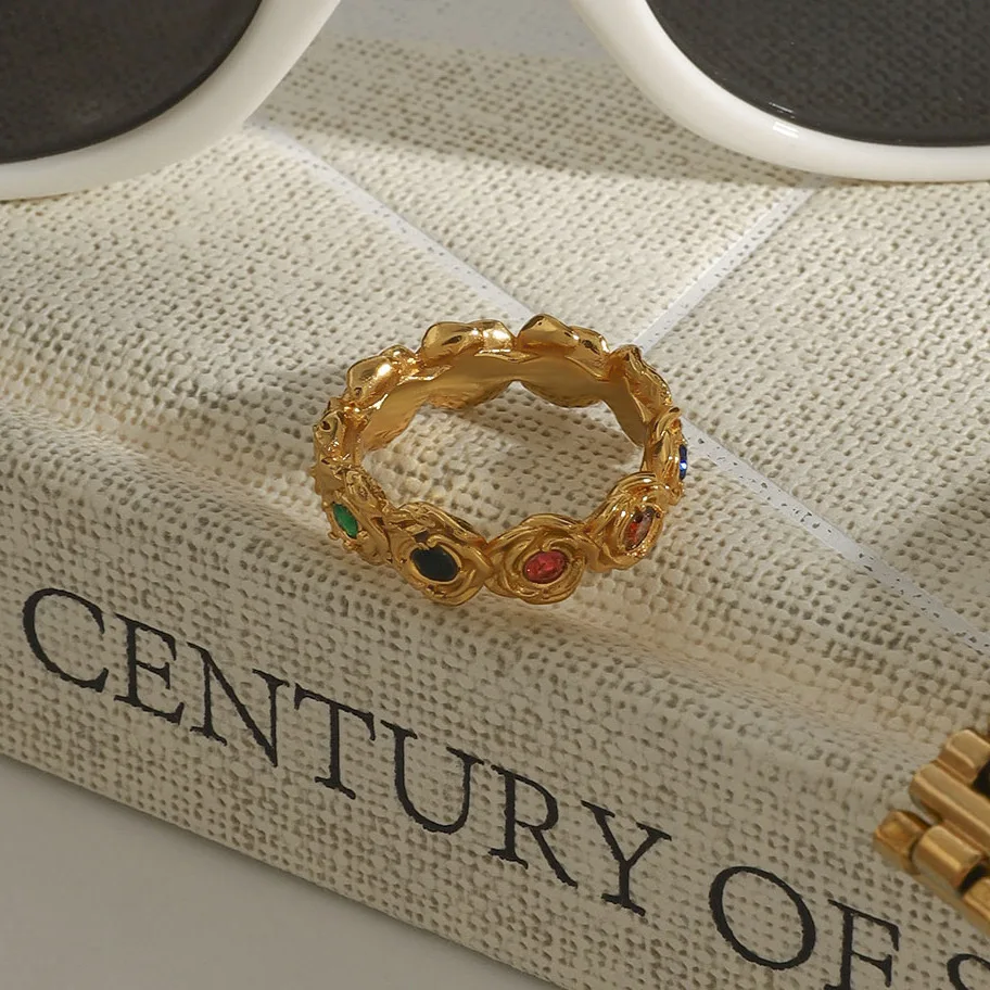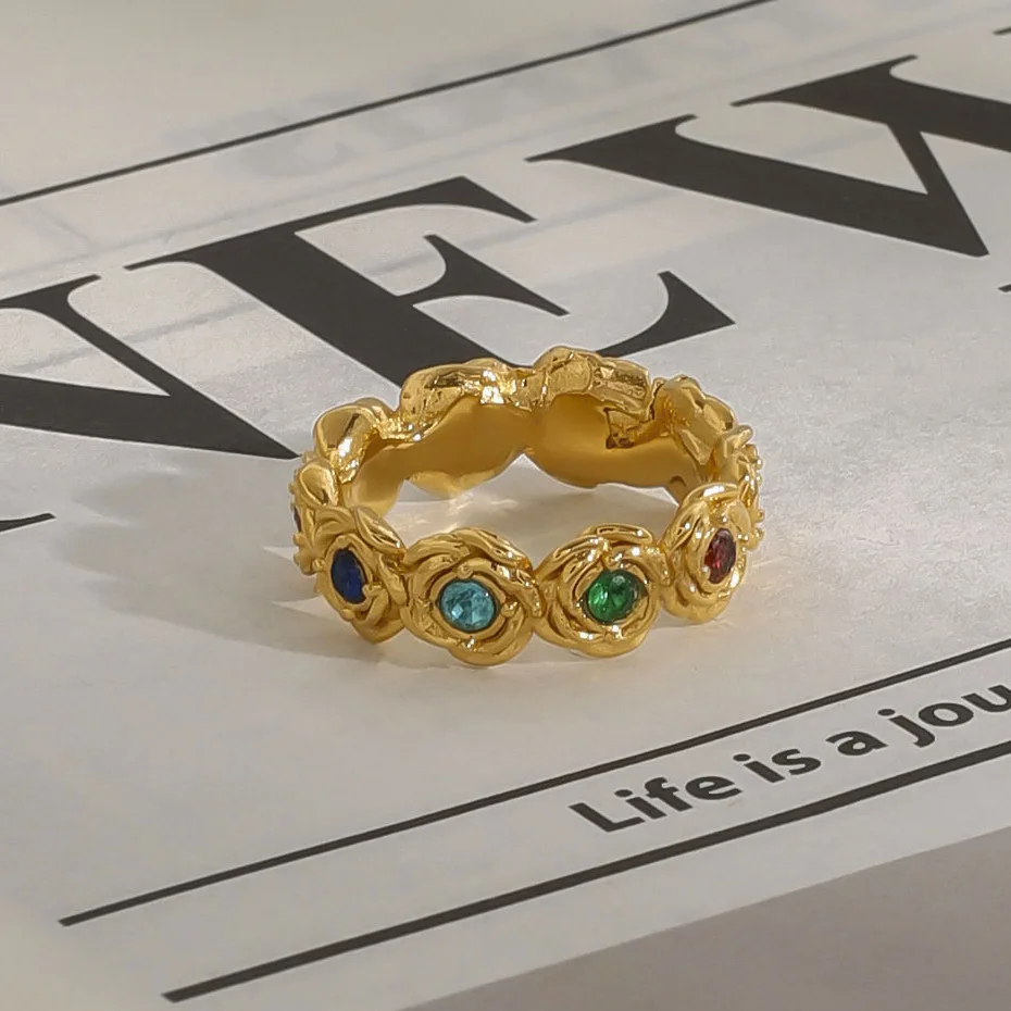 MW Women's Classic Stylish 18K Gold-Plated Stainless Steel Geometric Colorful Zircon Ring Daily Use Luxury High-End Jewelry for
