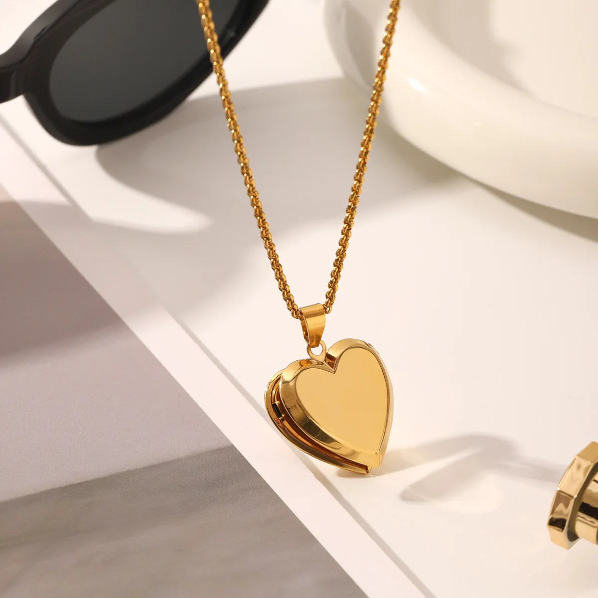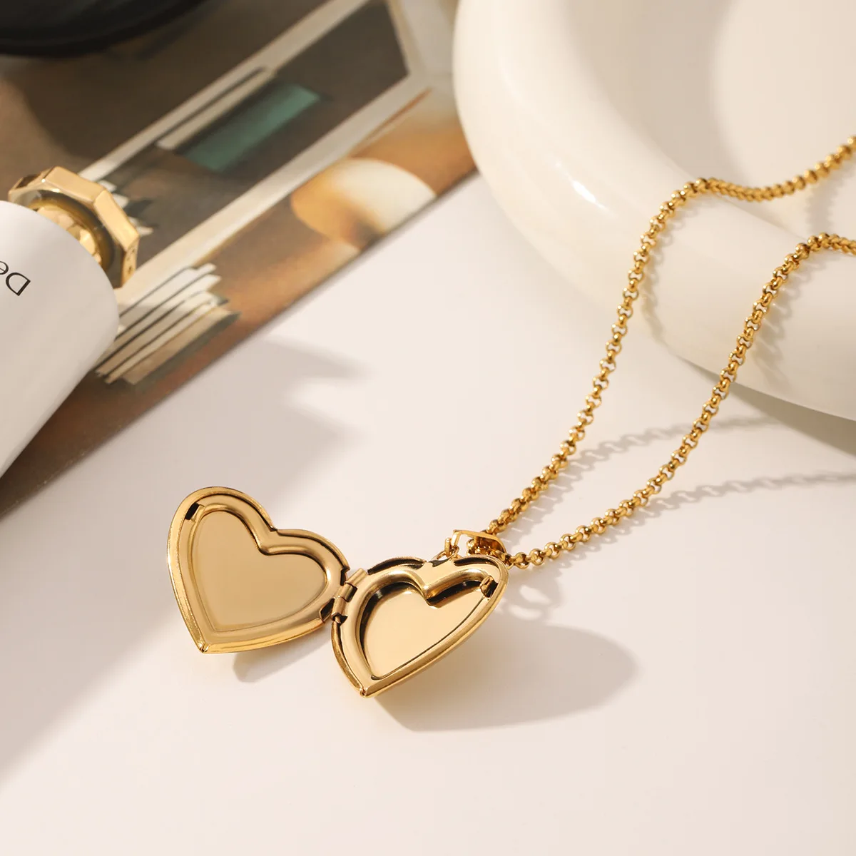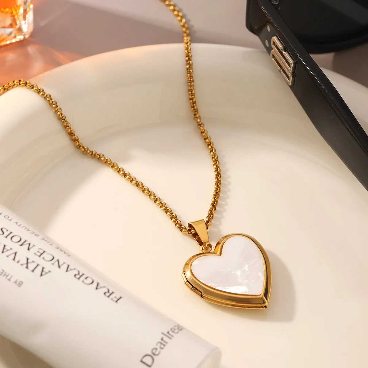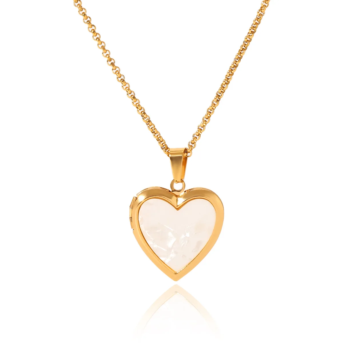 MW French Style White Shell Heart-Shaped Photo Box Pendant Necklace with 18K Gold Plated Stainless Steel Link Chain