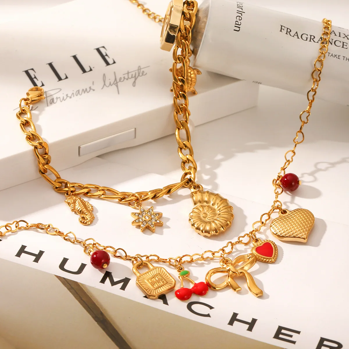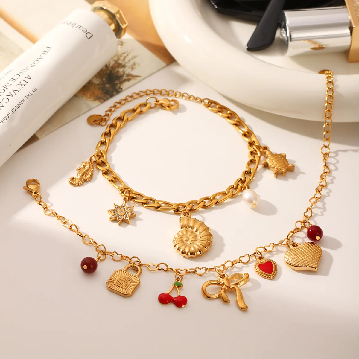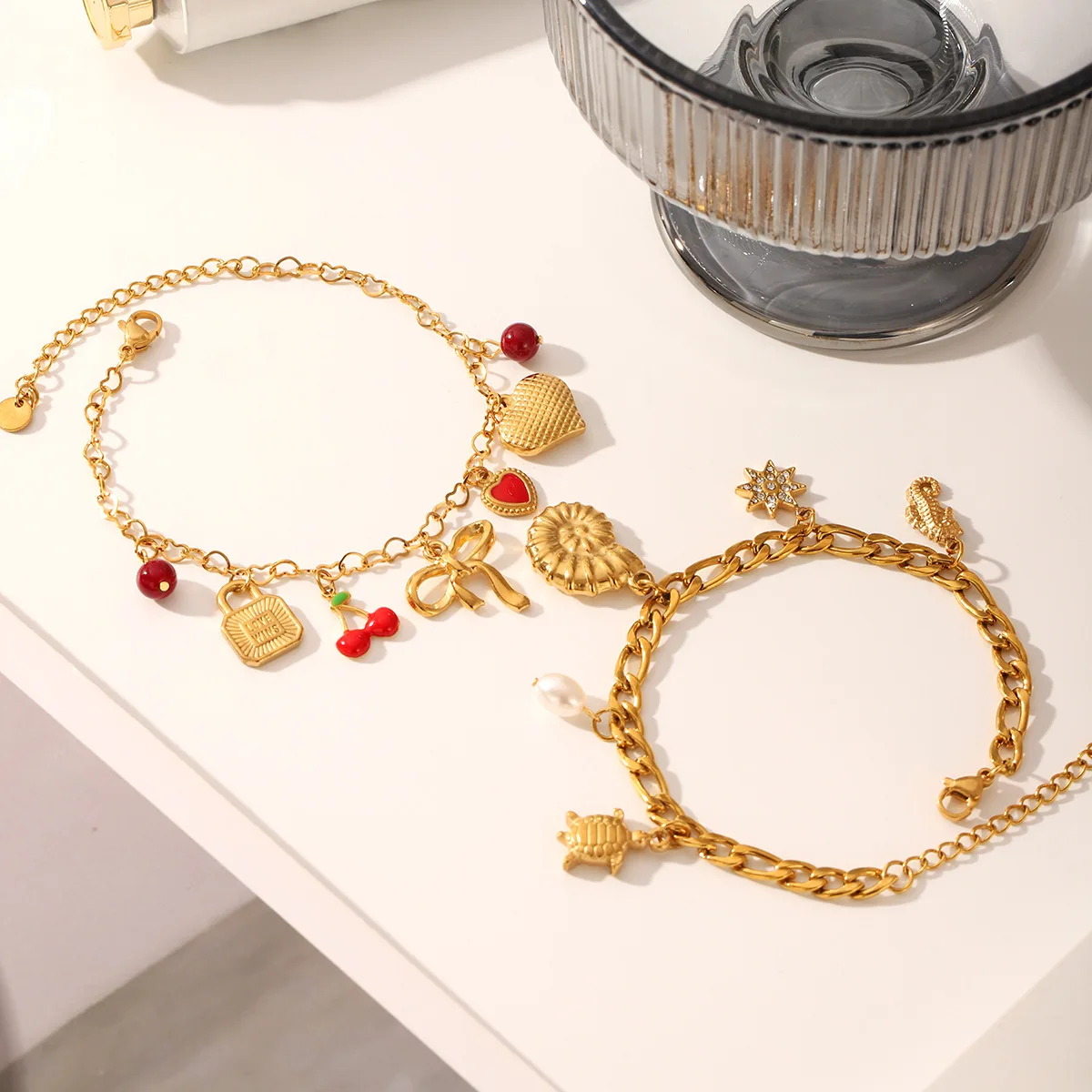 Cute 18K Gold Plated Zircon Bow Conch Heart Snail Shell Charms Stainless Steel Charm Bracelet for Women Cherry Trendy