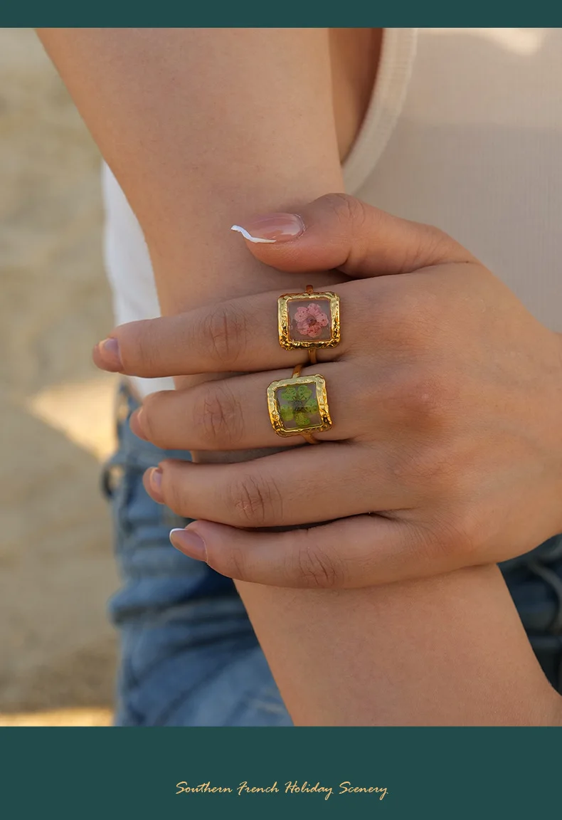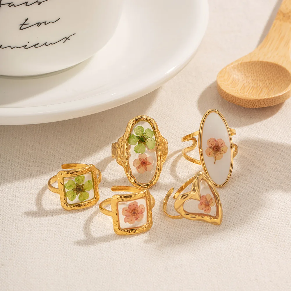 MW Women's 18K Gold-Plated Stainless Steel Ring with Geometric Shape & Inlaid Flowers - Open Adjustable Design