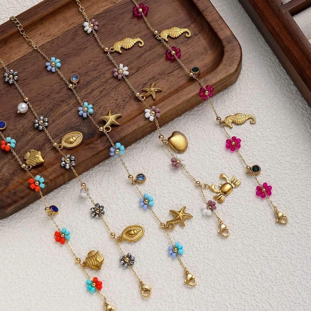 MW Wholesale Ocean Boho Bracelet: 18K Gold-Plated, Seahorse Conch Starfish & Colorful Stone Charm