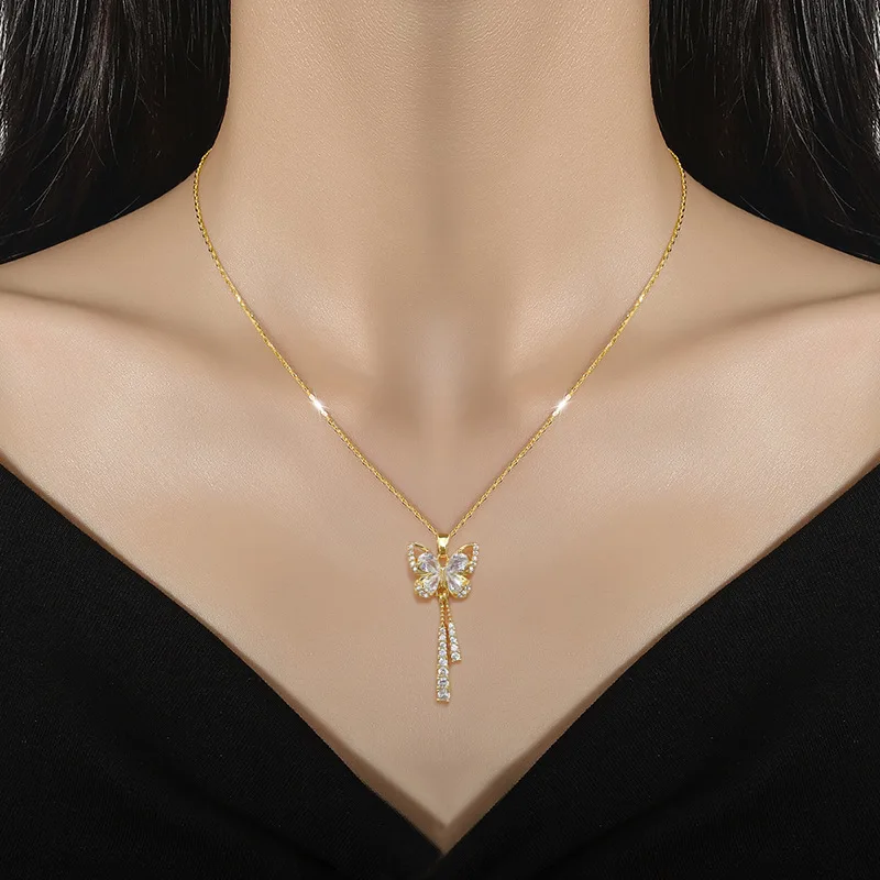 MW Women's Fashionable 18K Gold-Plated Stainless Steel Butterfly Tassel Necklace with Full Diamond Design