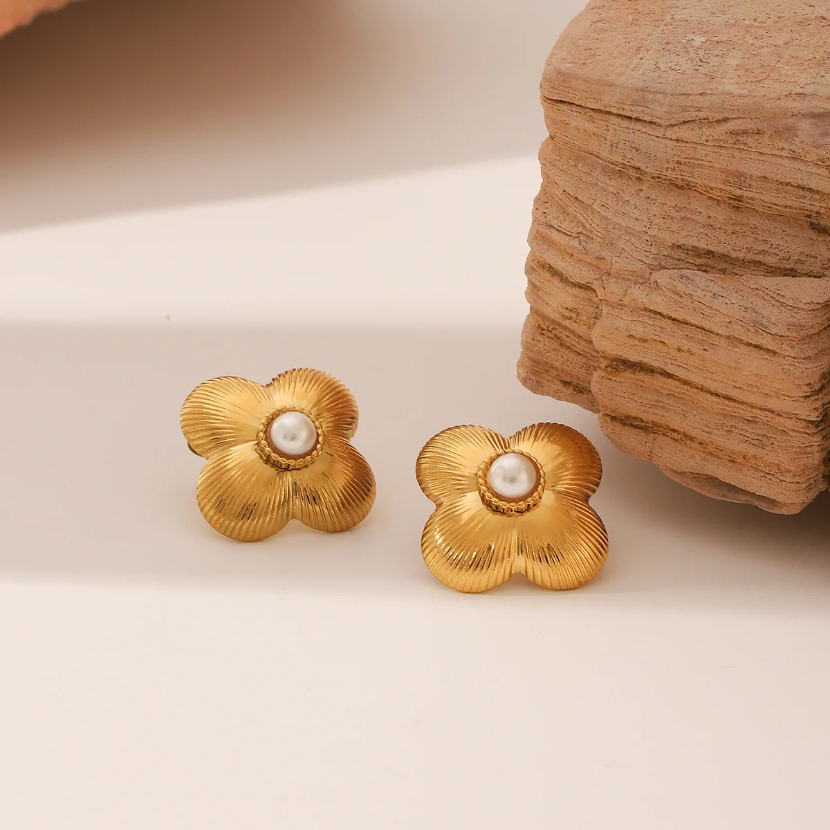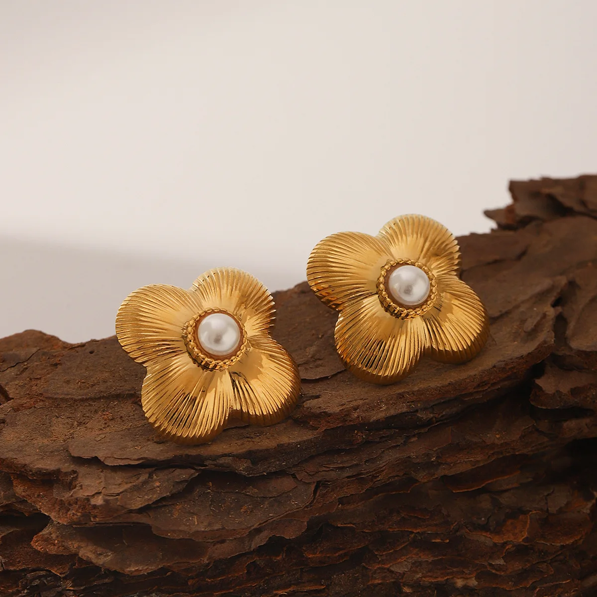 MW Vintage Style 18K Gold Plated Jewelry Waterproof Striped Flower Pearl Flower Stainless Steel Earrings Stud Earring