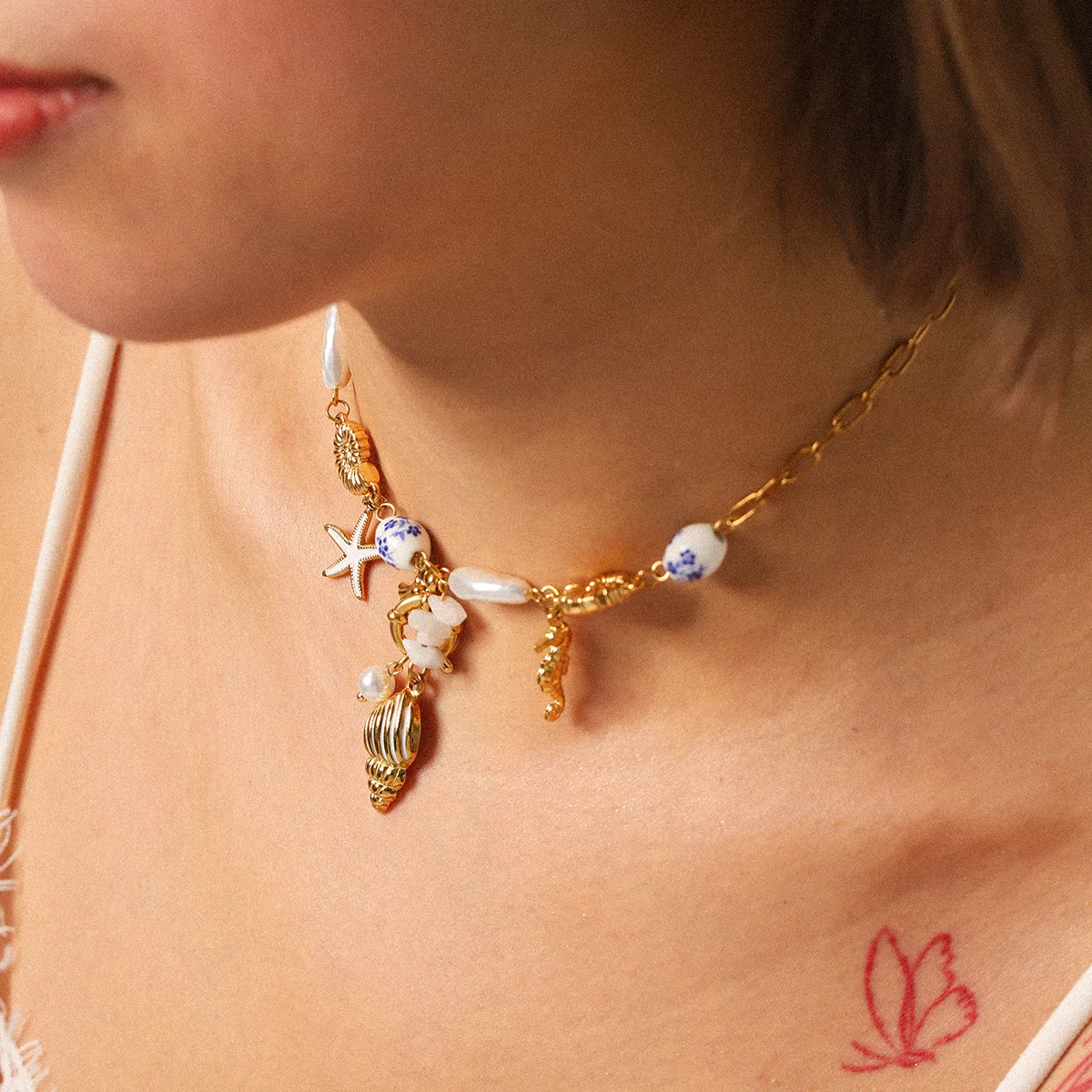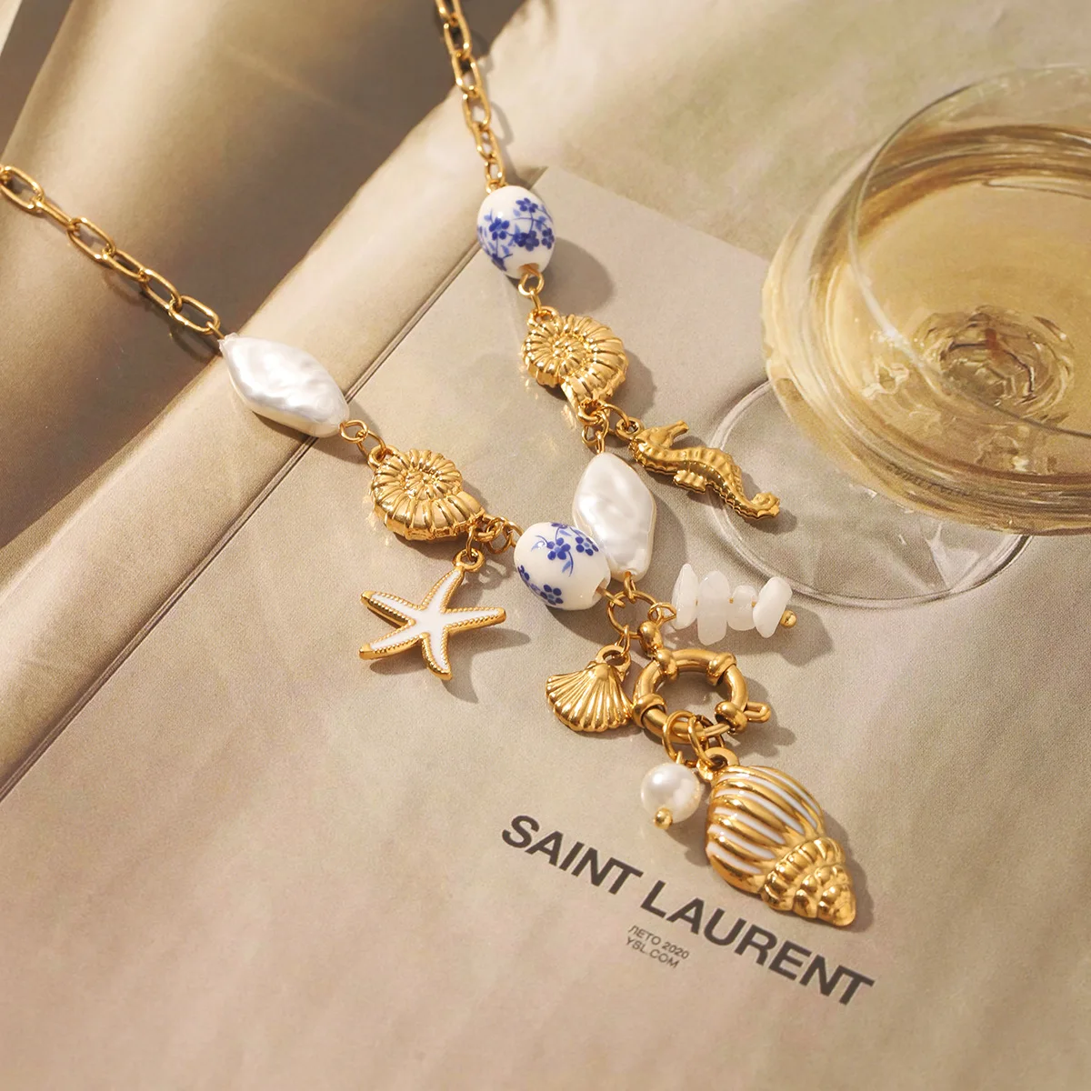 MW Ocean Stainless Steel 18K Gold Plated Chain Necklace Enameled Ceramics Shell Pearl Starfish Fashion Necklaces for Women