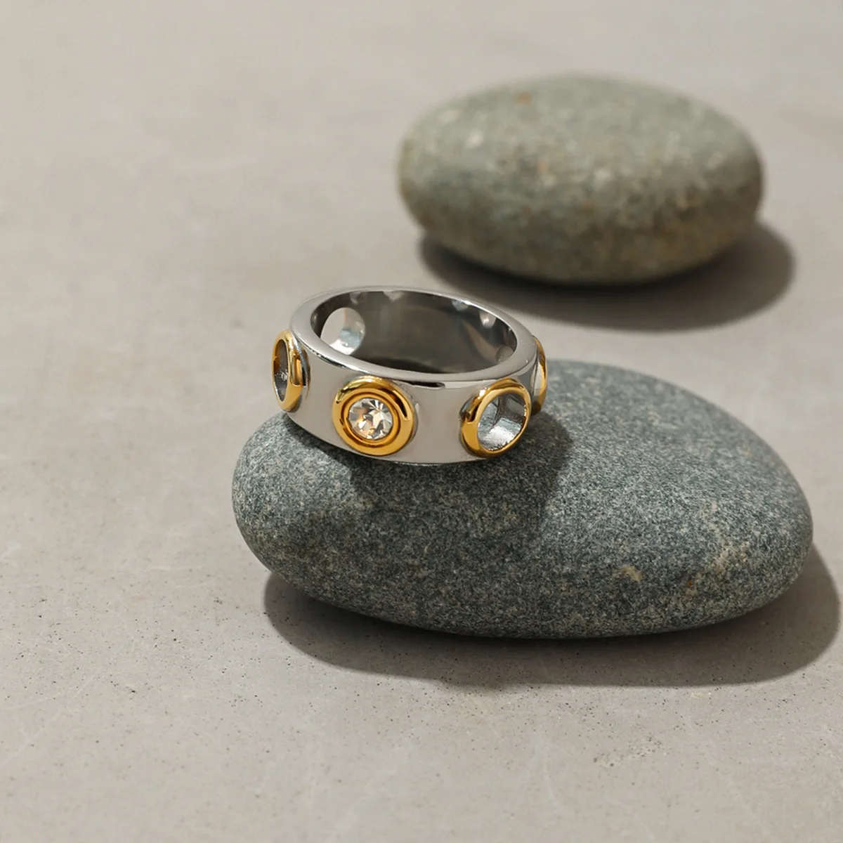 MW Women's Simple and Stylish 18K Gold-Plated Personalized Stainless Steel Two-Tone Hollow Waterproof Ring with Zircon Inlay