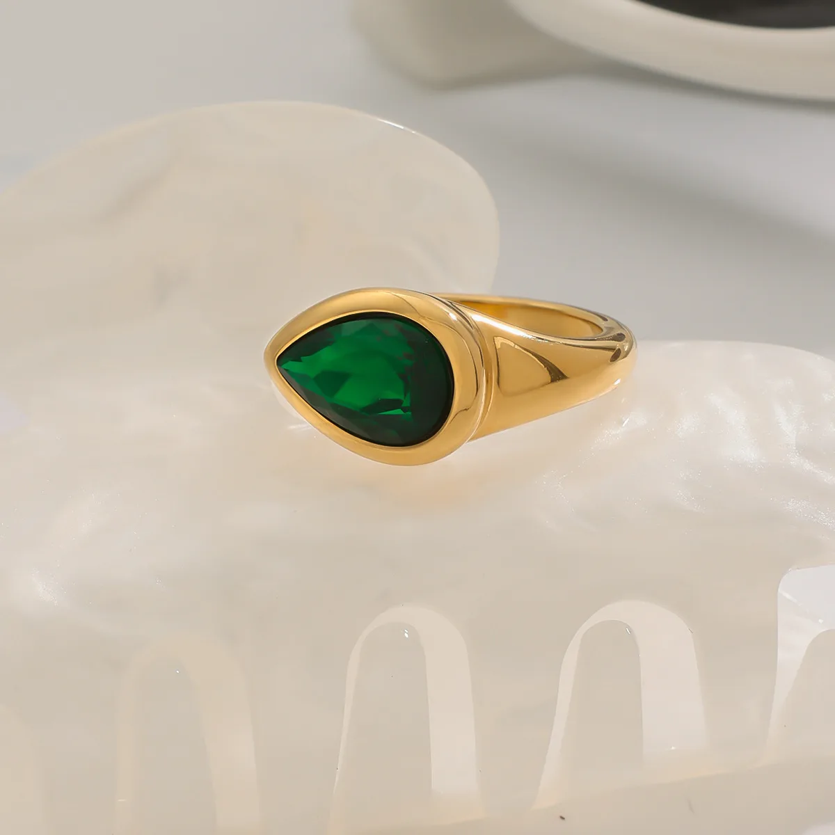 MW Women's Fashion 18K Gold-Plated Stainless Steel Ring with Emerald Zircon Inlay, Teardrop-Shaped & Waterproof Fadeless