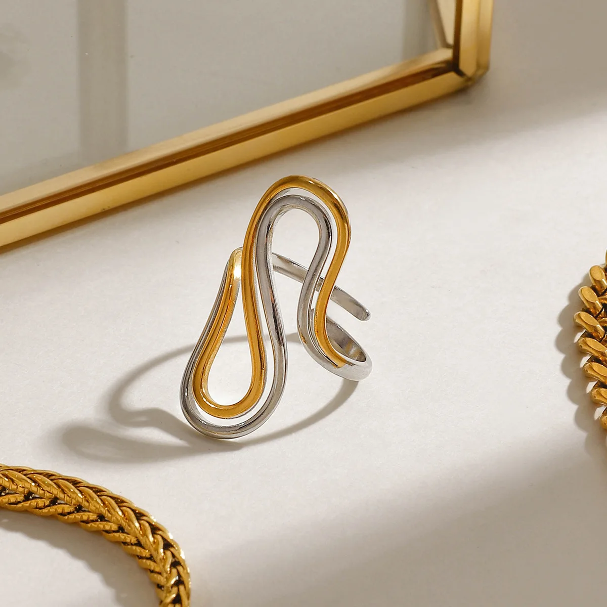 MW Women's Minimalist Fashion 18K Gold-Plated Stainless Steel Geometric Double Layer S-Shaped Ring Waterproof Adjustable Daily