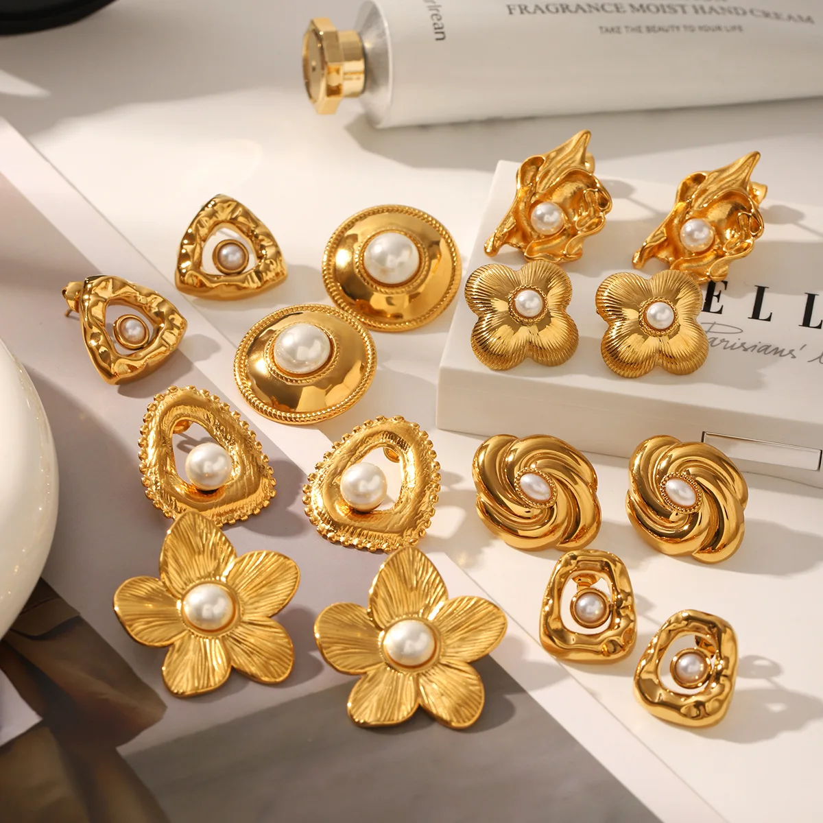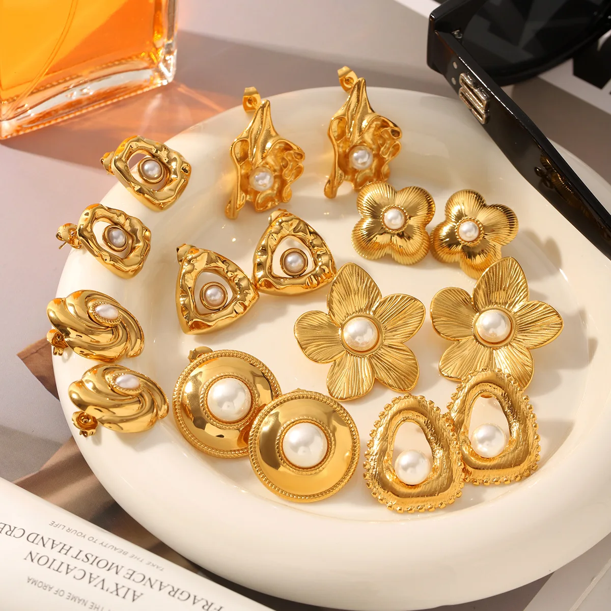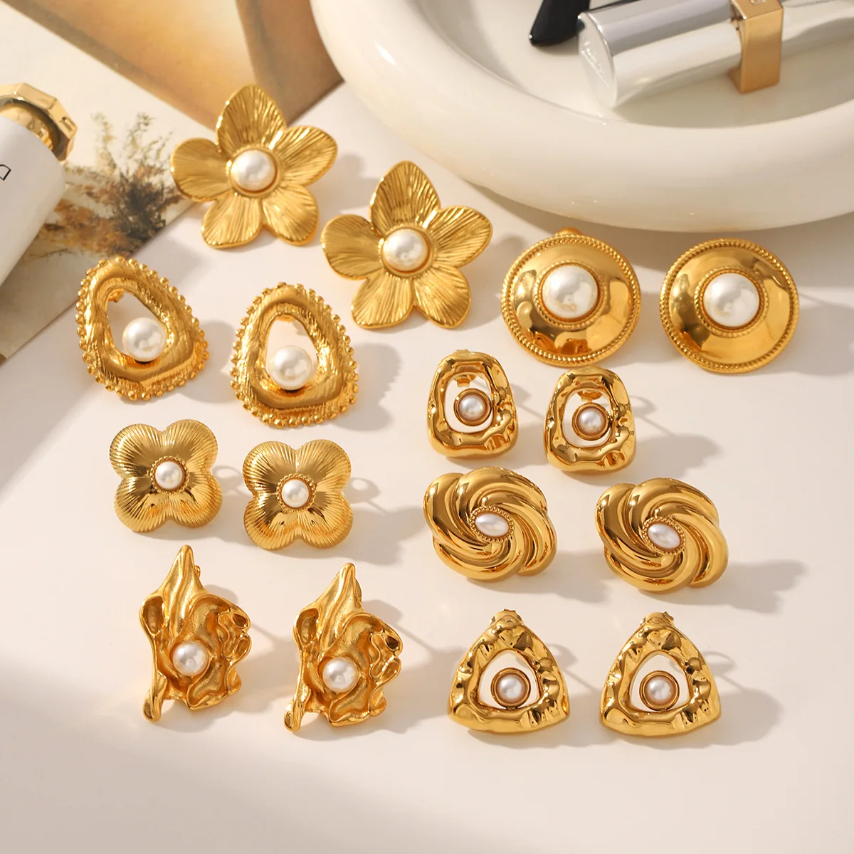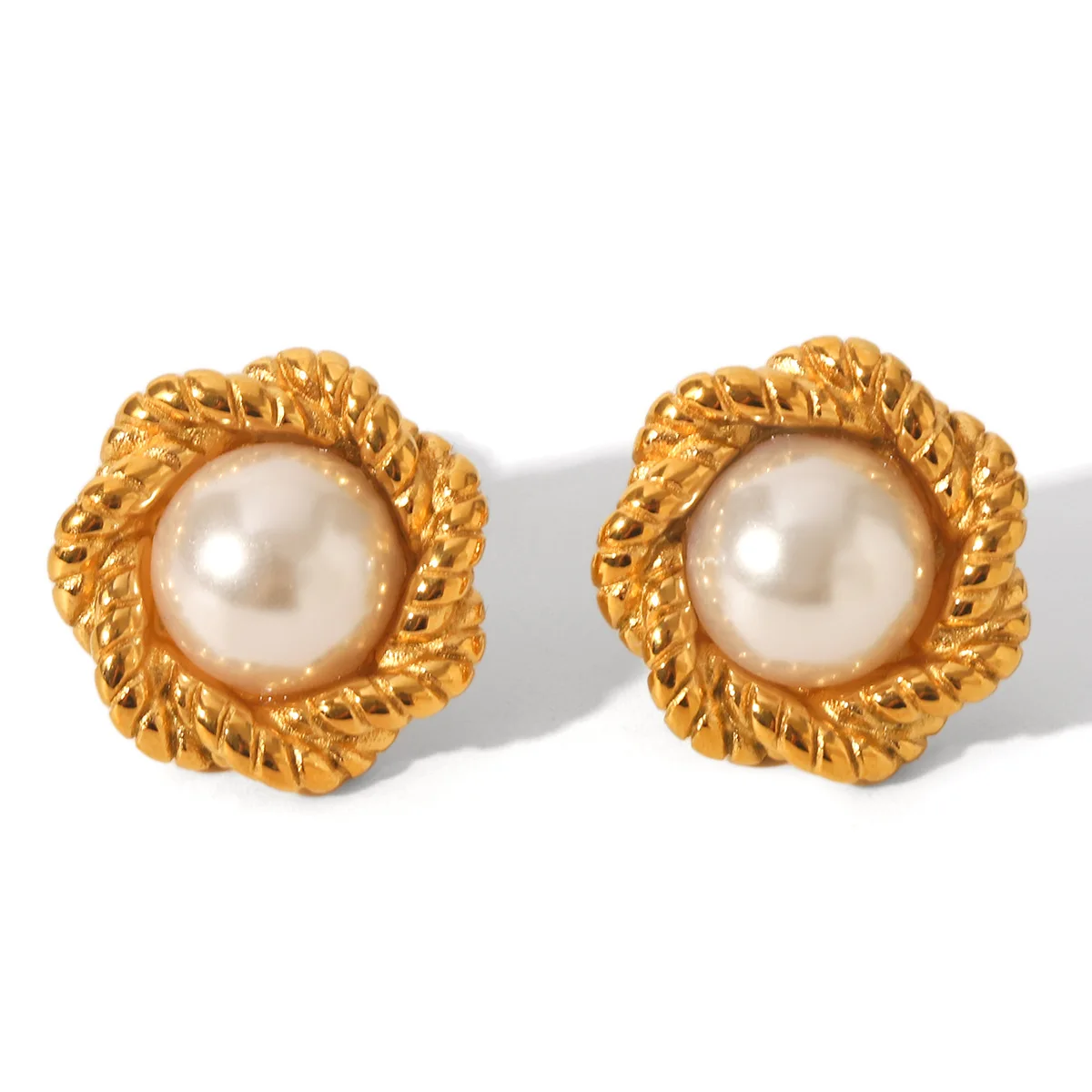 Global Best Seller High-Grade Stainless Steel Geometric Flower Shape Pearl Earrings Luxury Stud Earrings for Women Trendy Style