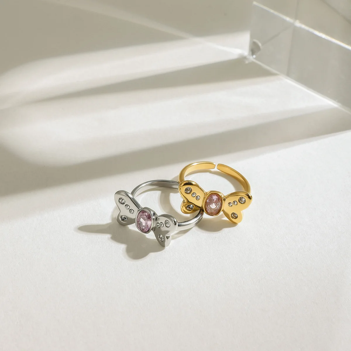 MW Valentine's Day Gift Sweet Romantic 18K Gold Stainless Steel Zircon Rhinestone butterfly Open Rings Stainless Steel Bow Ring