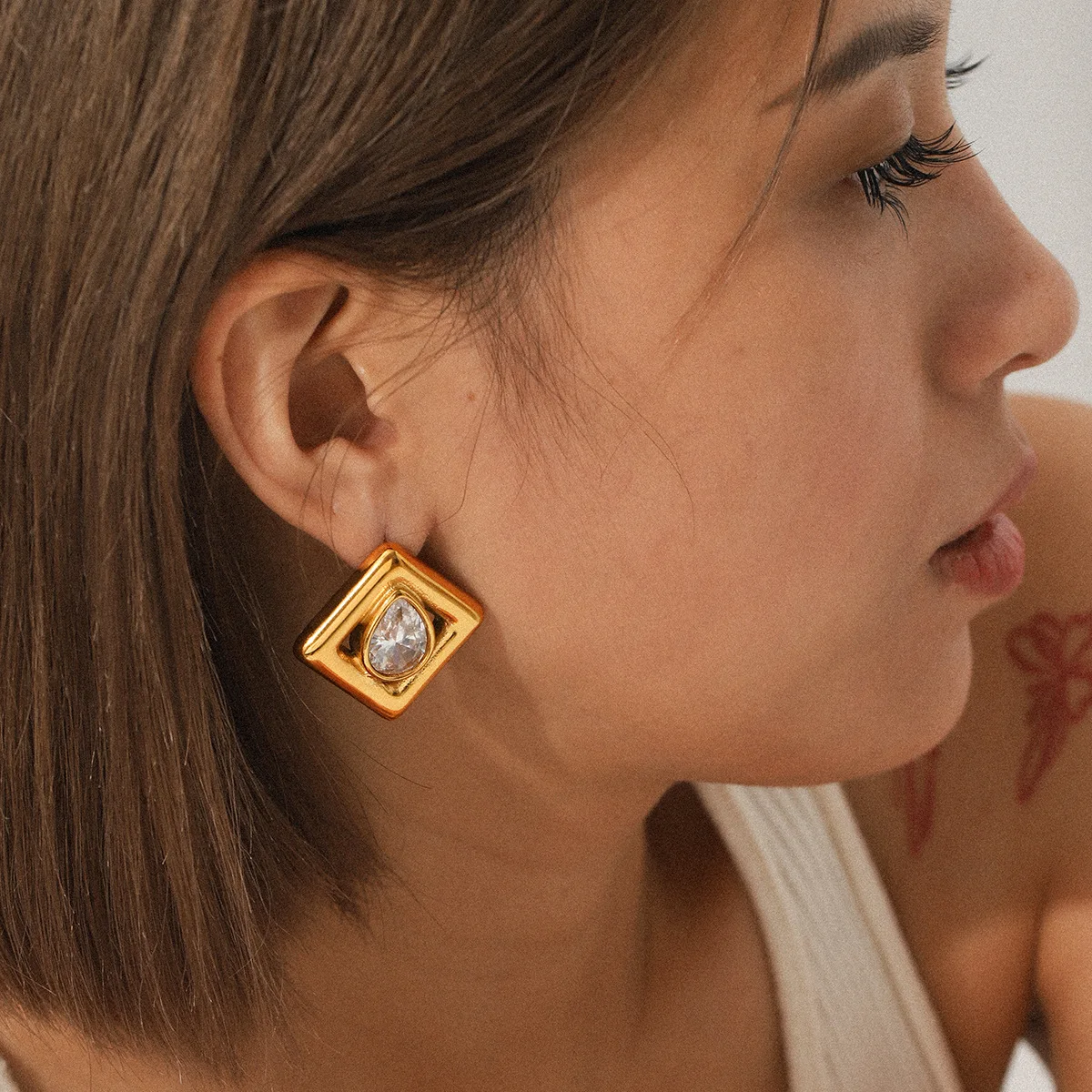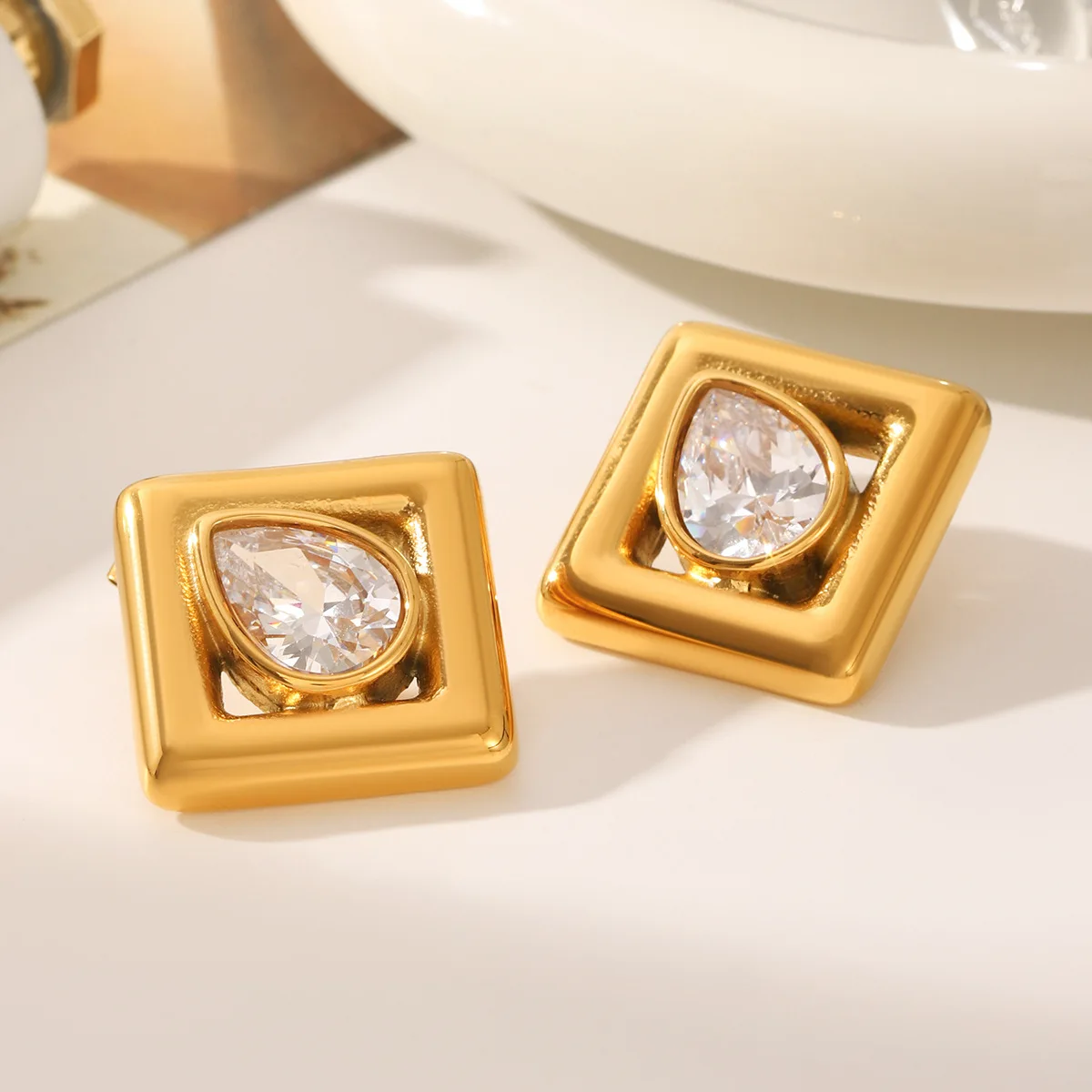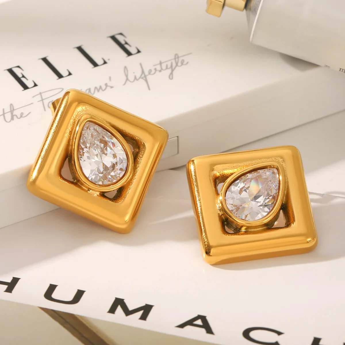 MW Elegant Classic Retro Statement Non-Tarnish Women's Party Jewelry 18K Gold Plated Stainless Steel Water Drop Zircon Stud