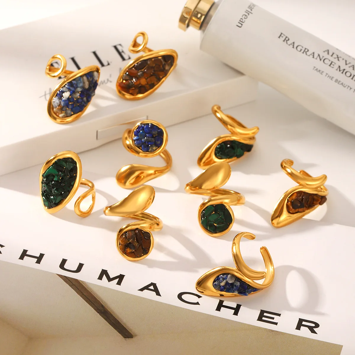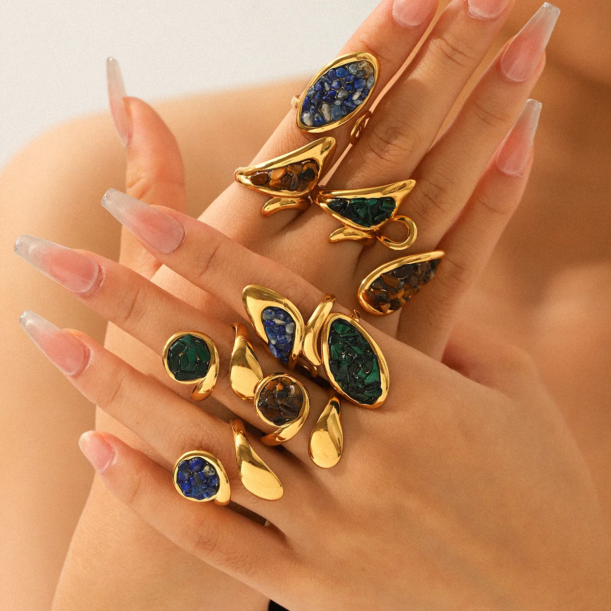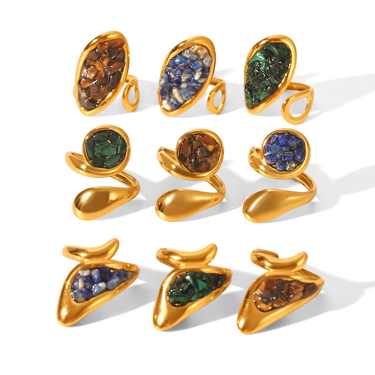 MW 18K Gold PVD Plated Retro Vintage Natural Stone Opening Ring Waterproof Ring Jewelry Women Stainless Steel Rings Green