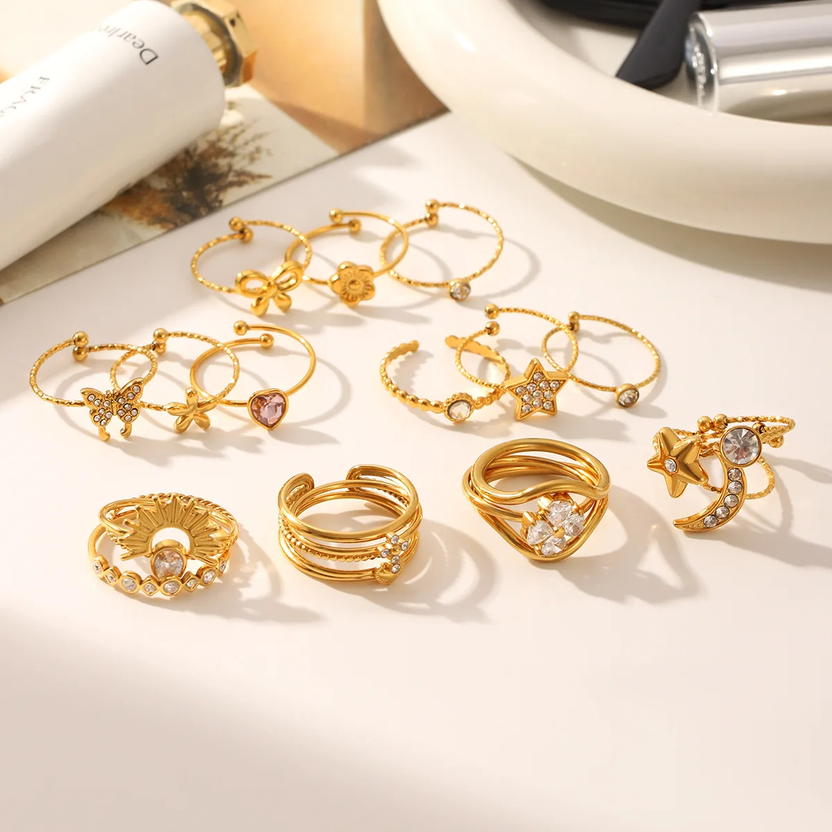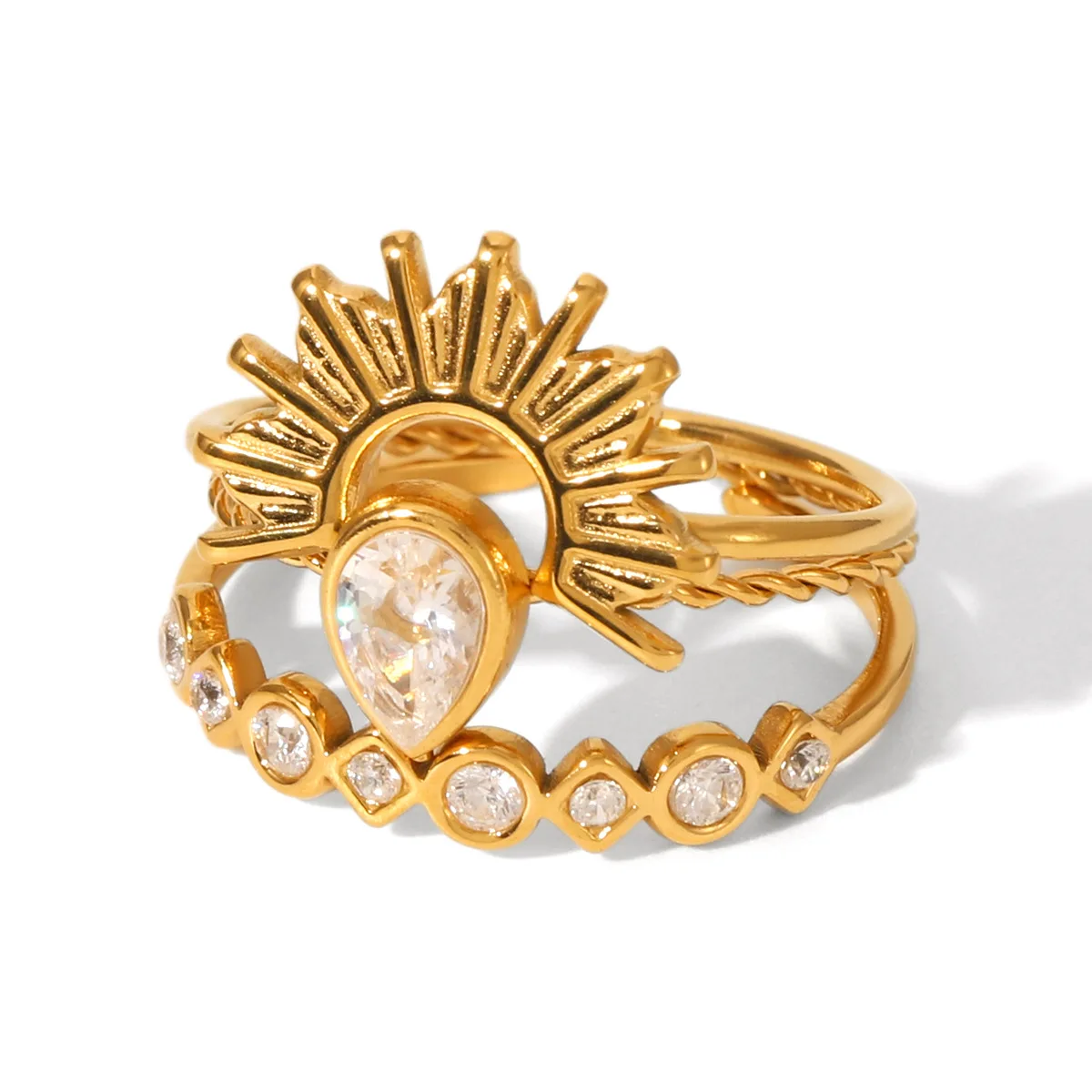 MW Four-Leaf Fashionable Minimalist 18K Gold PVD Stainless Steel Plating Rope Texture Band Sun Zircon Stackle Ring