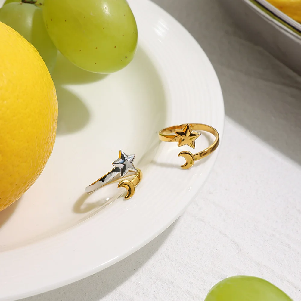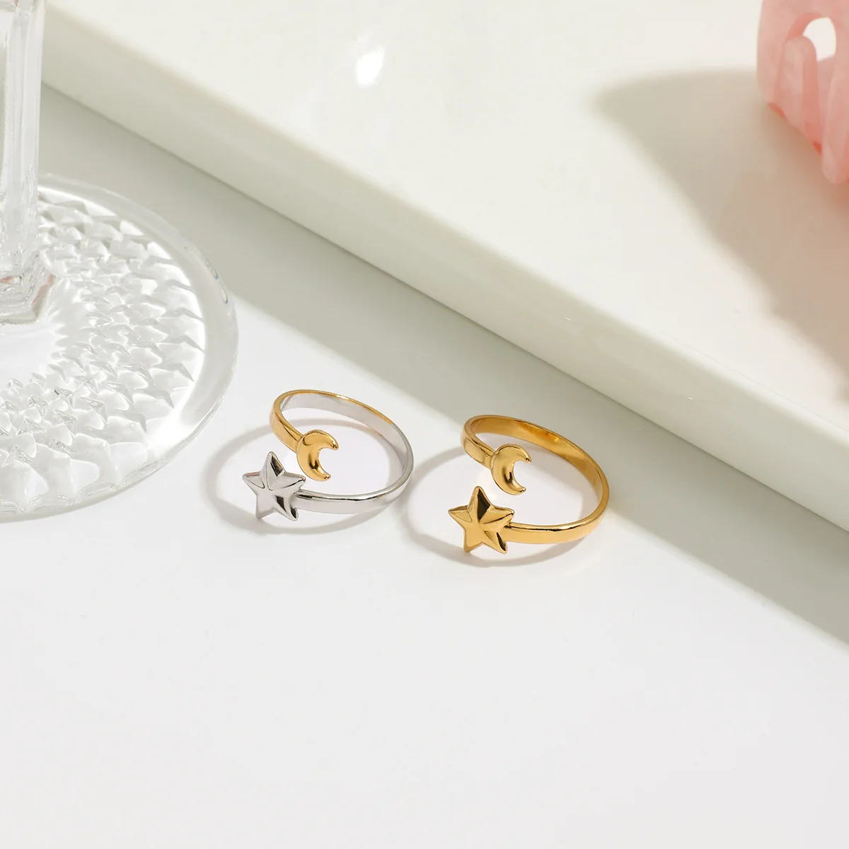 MW Women's Fashion Two-Tone 18K Gold-Plated Stainless Steel Ring with Star and Moon Motifs and Adjustable Open Design