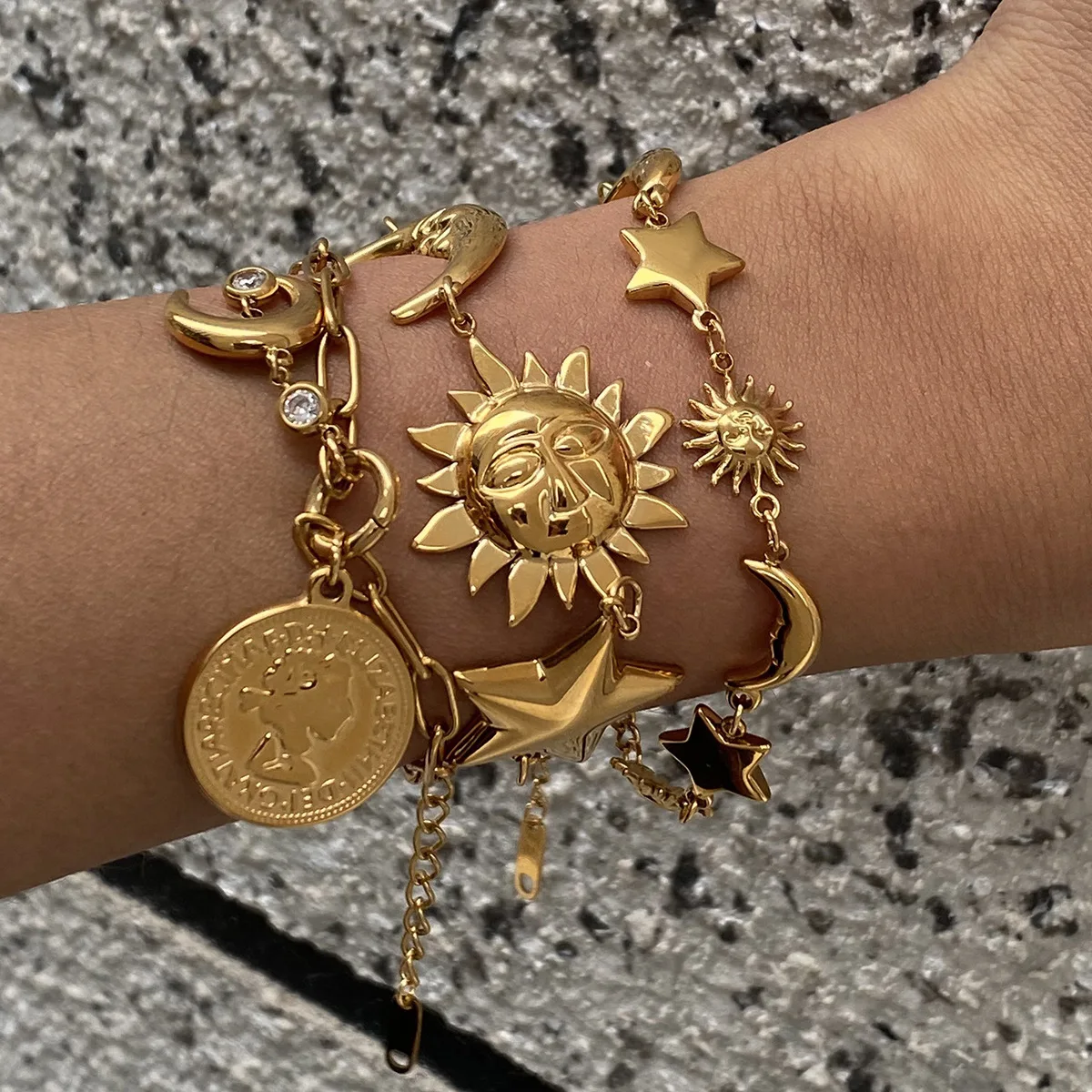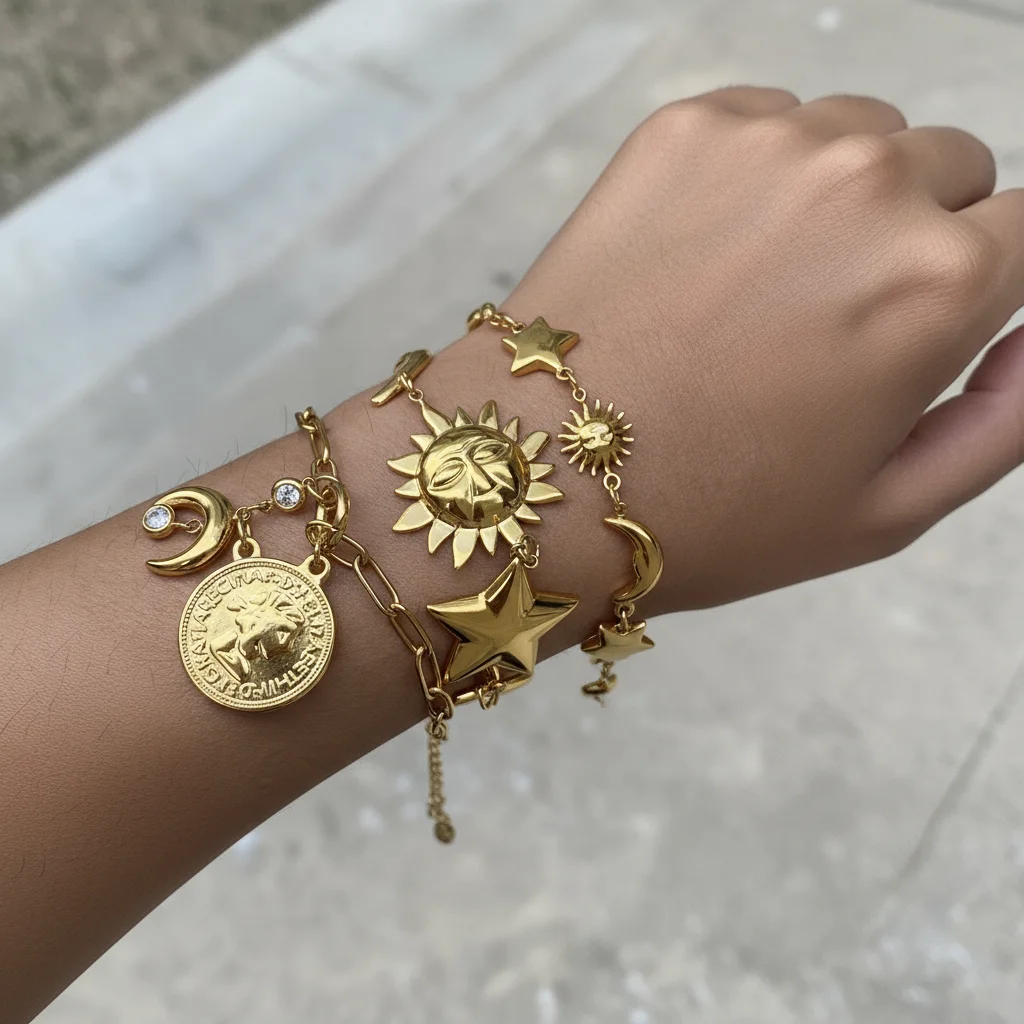 MW Waterproof Stackable Coin Sun Pendant Beach Ocean Star Moon Bracelet 316l Stainless Steel Jewelry 18k PVD Gold Bracelet