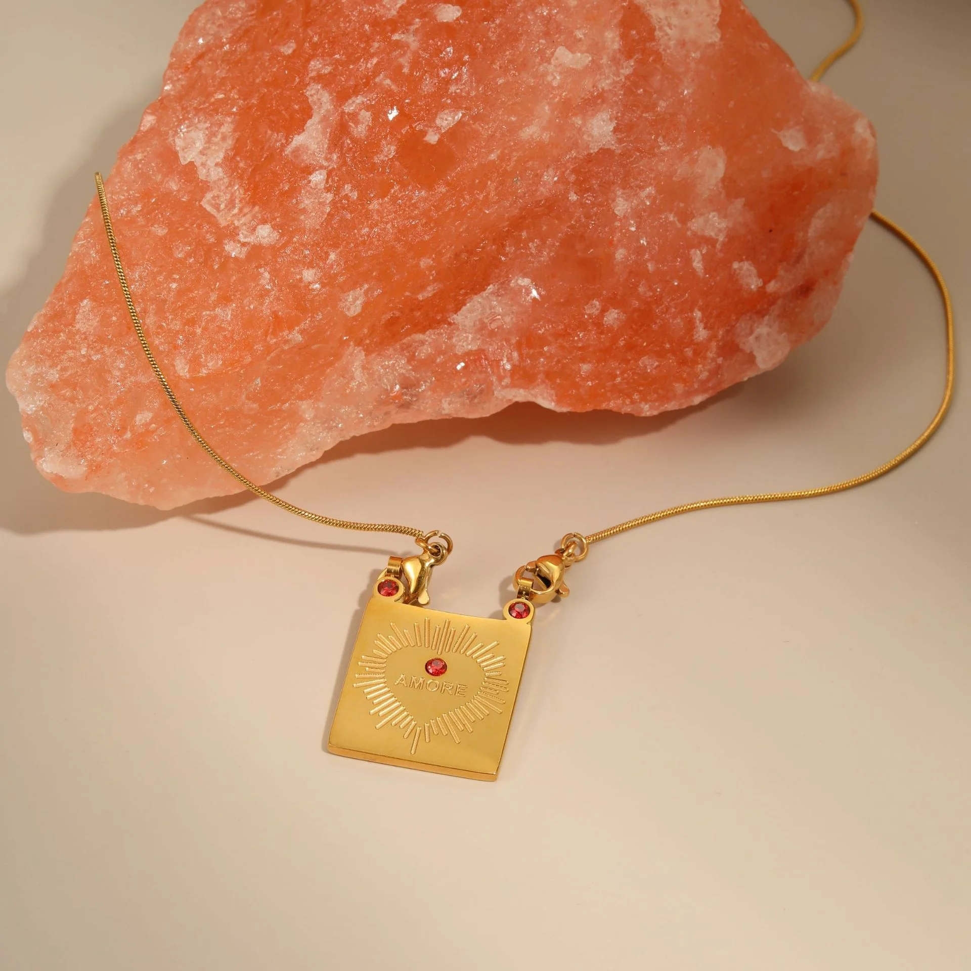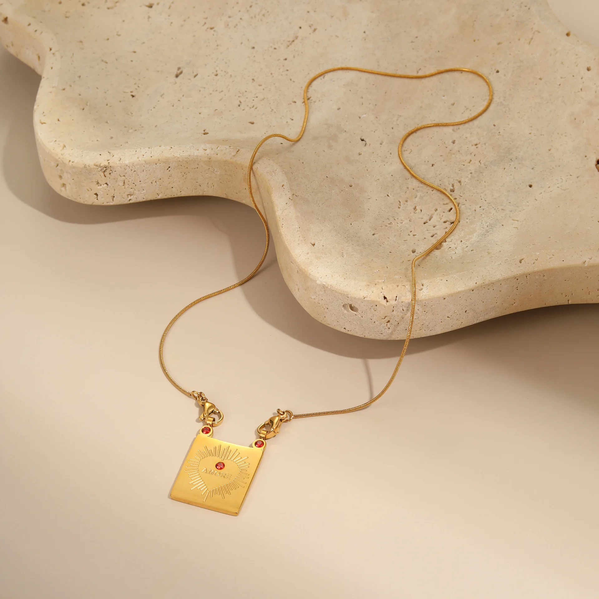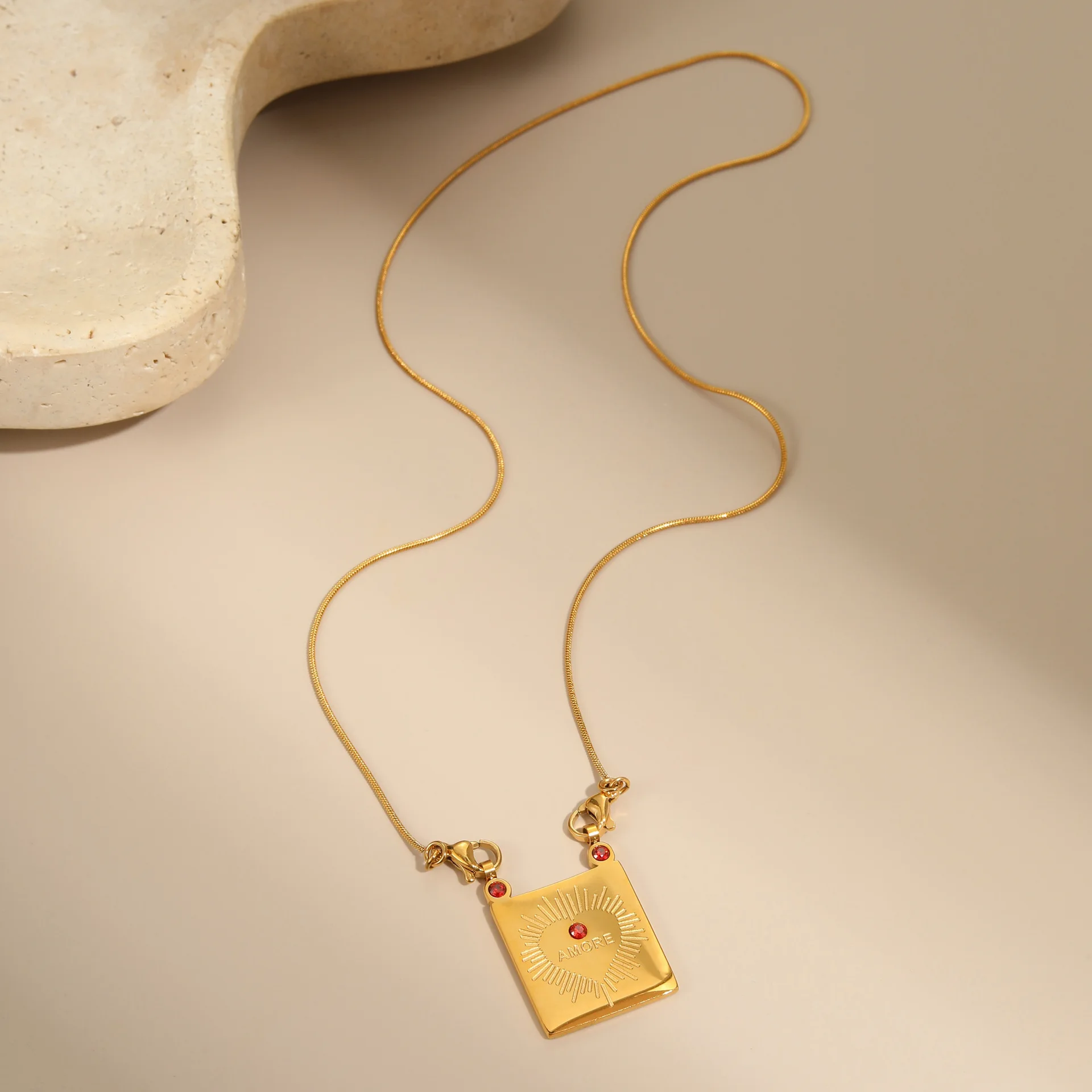 MW 18K PVD Gold Plated Waterproof Diamond Rectangle Burst Stainless Steel Geometric Heart Shape Pendant Zircon Necklace