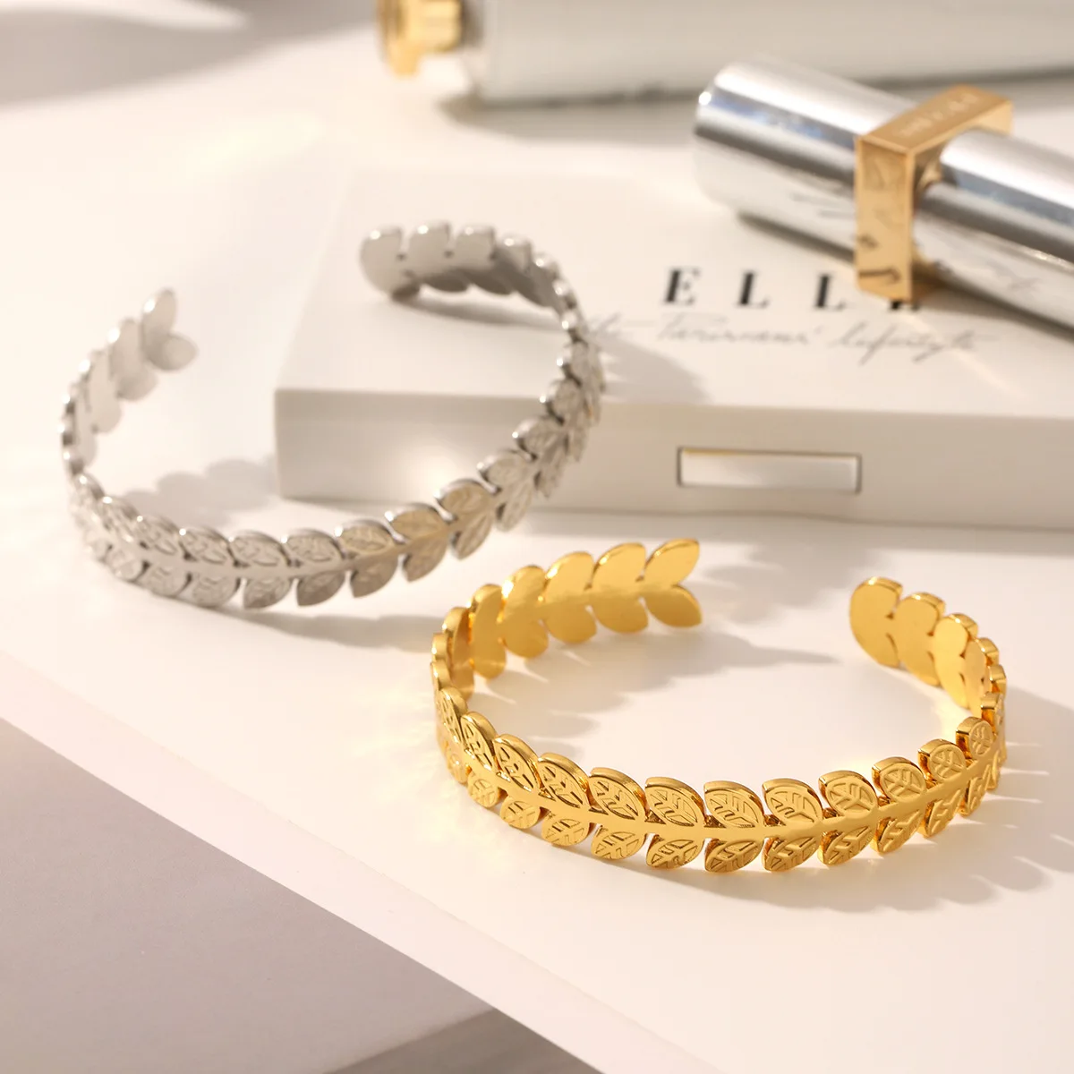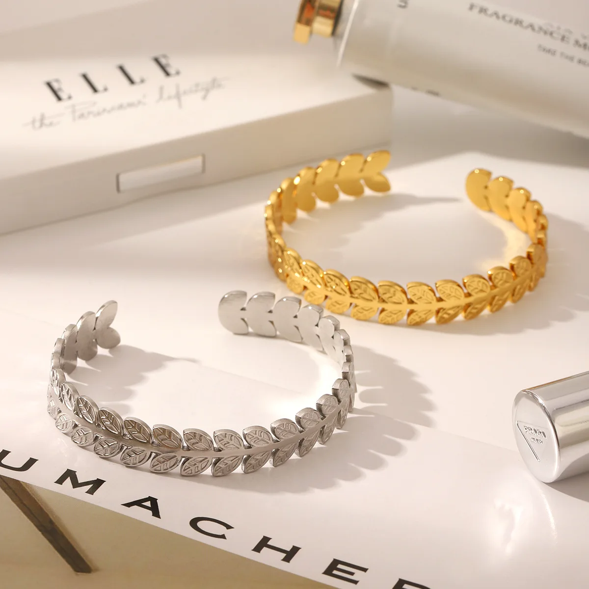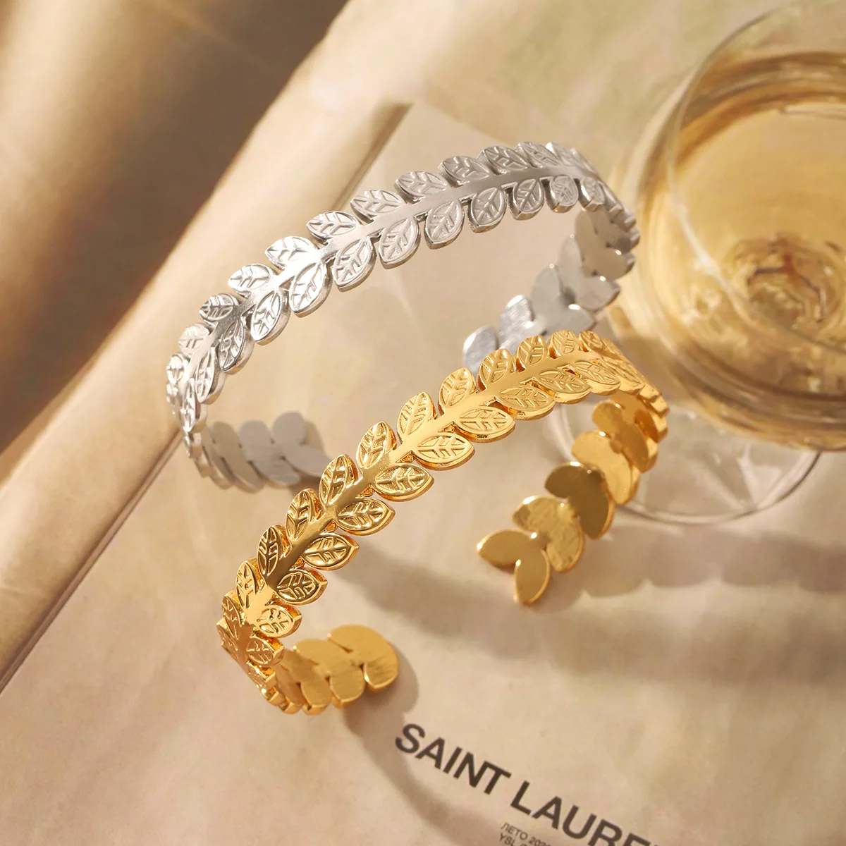 MW New Waterproof Stainless Steel 18K Gold Plated Leaf Chunky Bangle Cuff Bracelet Women Fashion Jewelry Adjustable Size Wedding