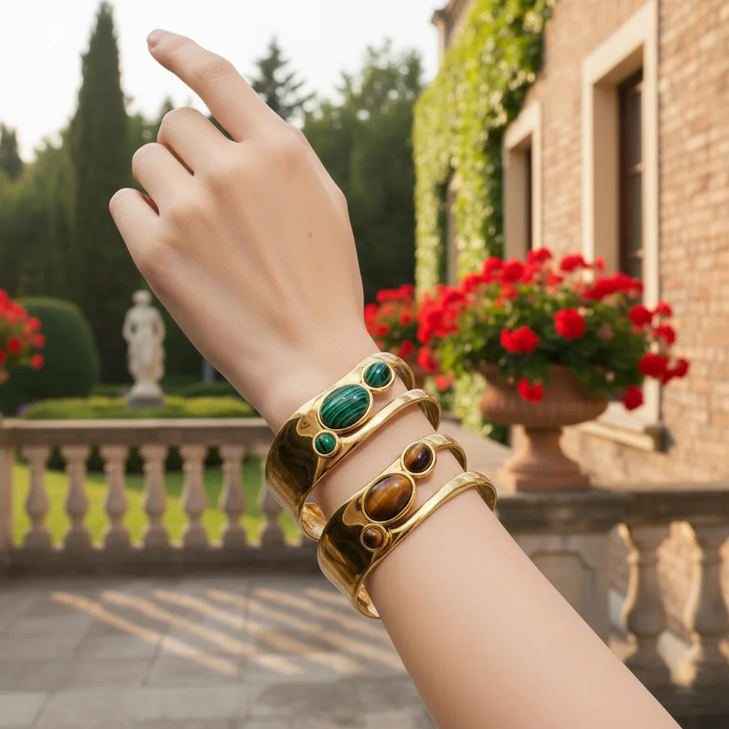 MW Boho Vintage Malachite Bezel Bracelets 18K Faux Pearl Openwork Adjustable Gold Big Bangles Stainless Steel Chunky Bracelet