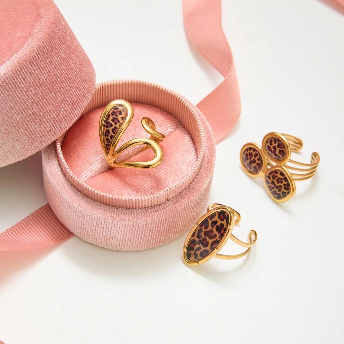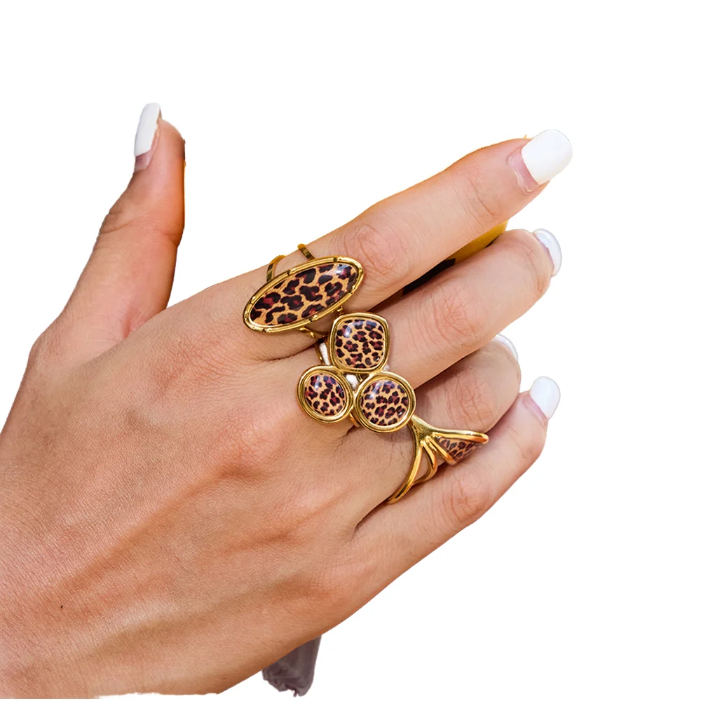 MW Trendy Retro Style 18K Gold Plated Stainless Steel Oval Asymmetrical Hollow Leopard Print Open Rings Set for Wedding Gift