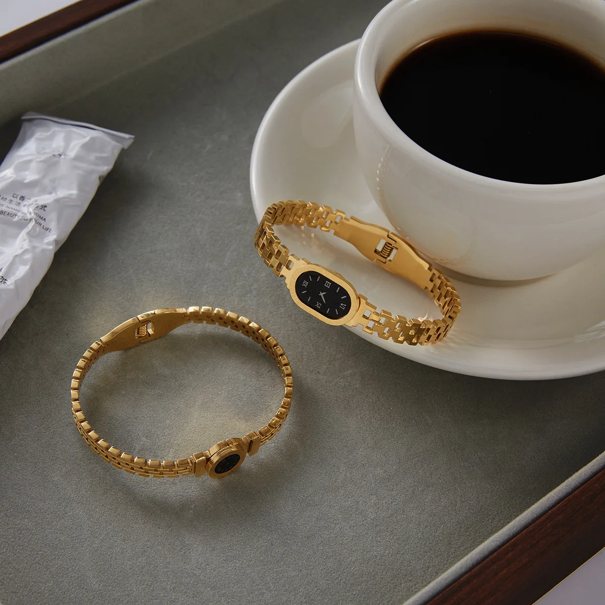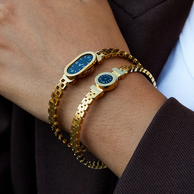 MW Waterproof 18K PVD Gold-Plated Stainless Steel Bangle Simple Design with Oval Round Acrylic Roman Numeral Watch Hinge Closure