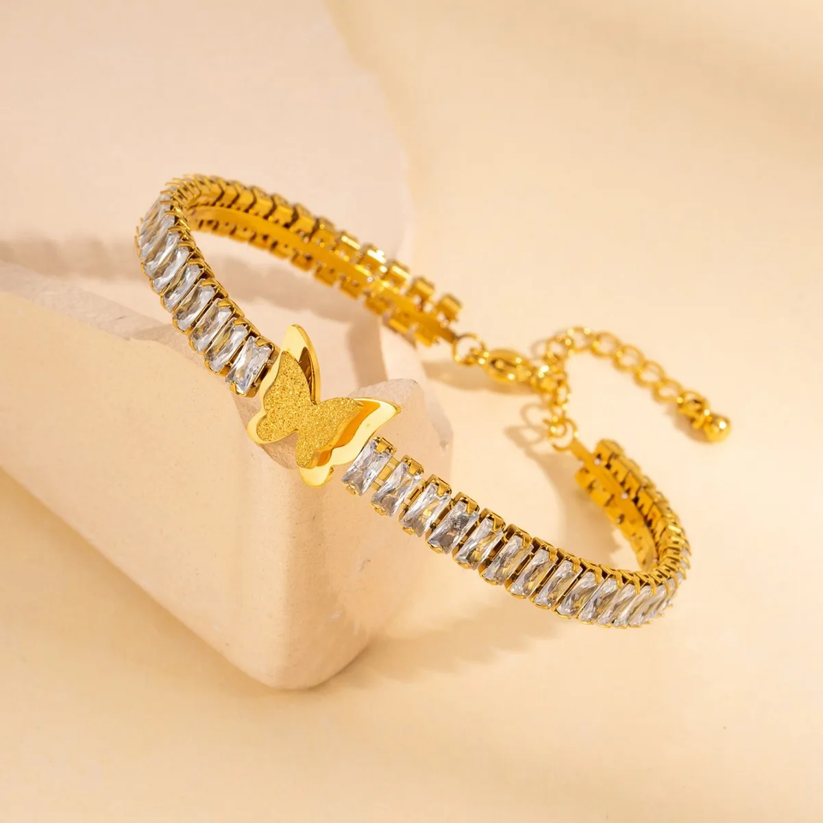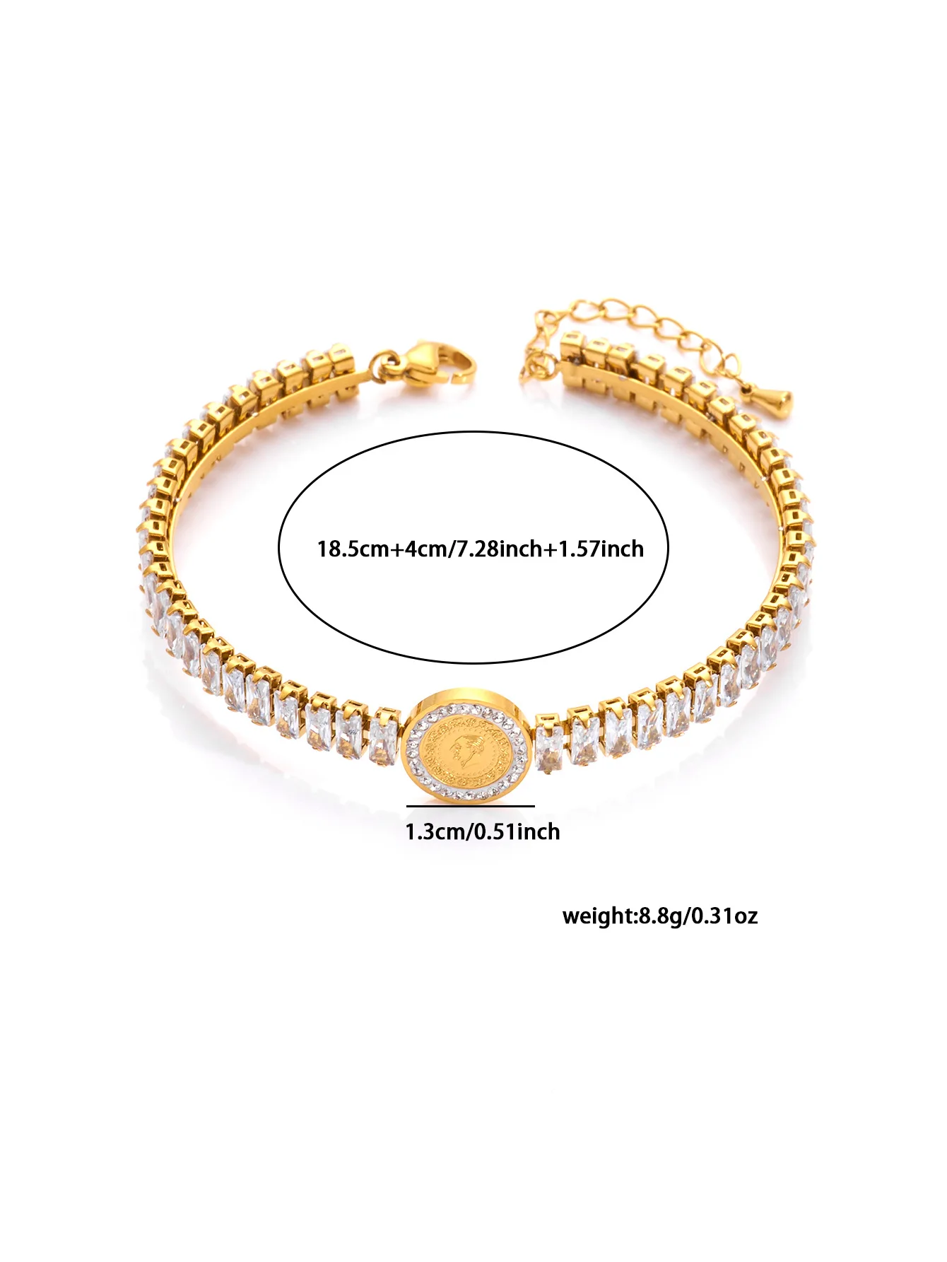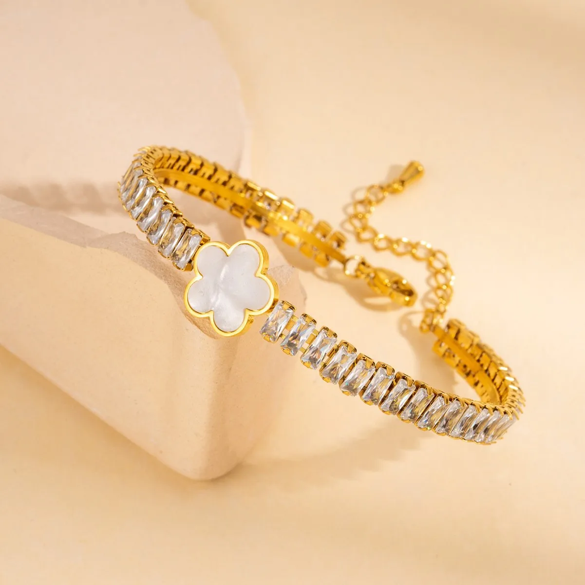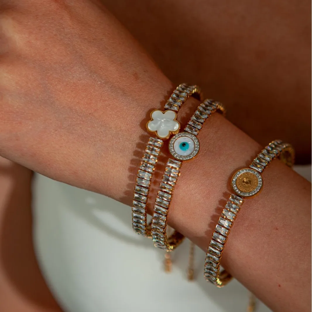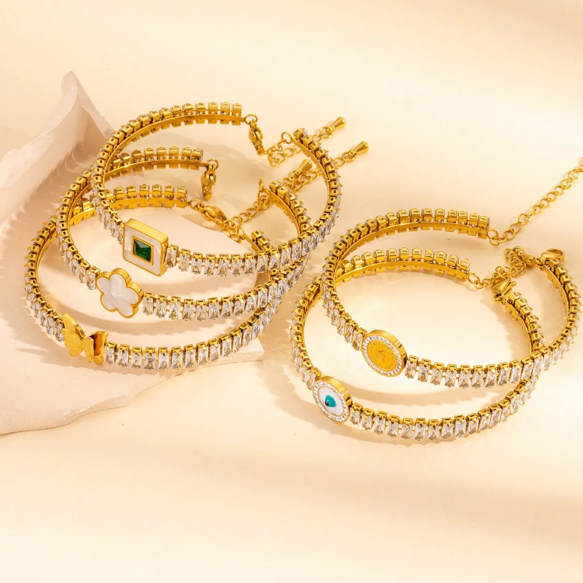 MW Hypoallergenic 18K Gold Plated Stainless Steel Bracelet - Women's Zircon Emerald Square Gem Oil-Drop Eye Heart Anti-Tarnish