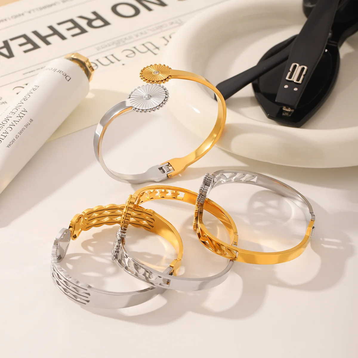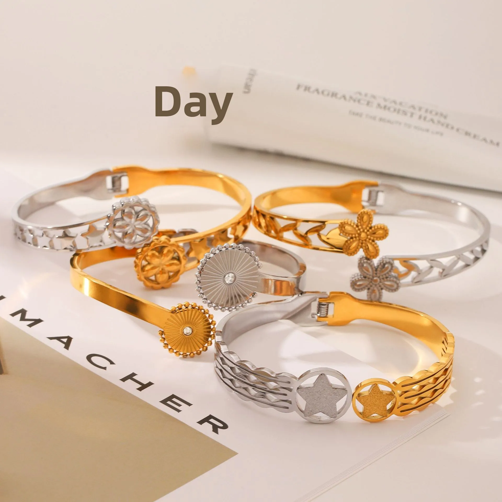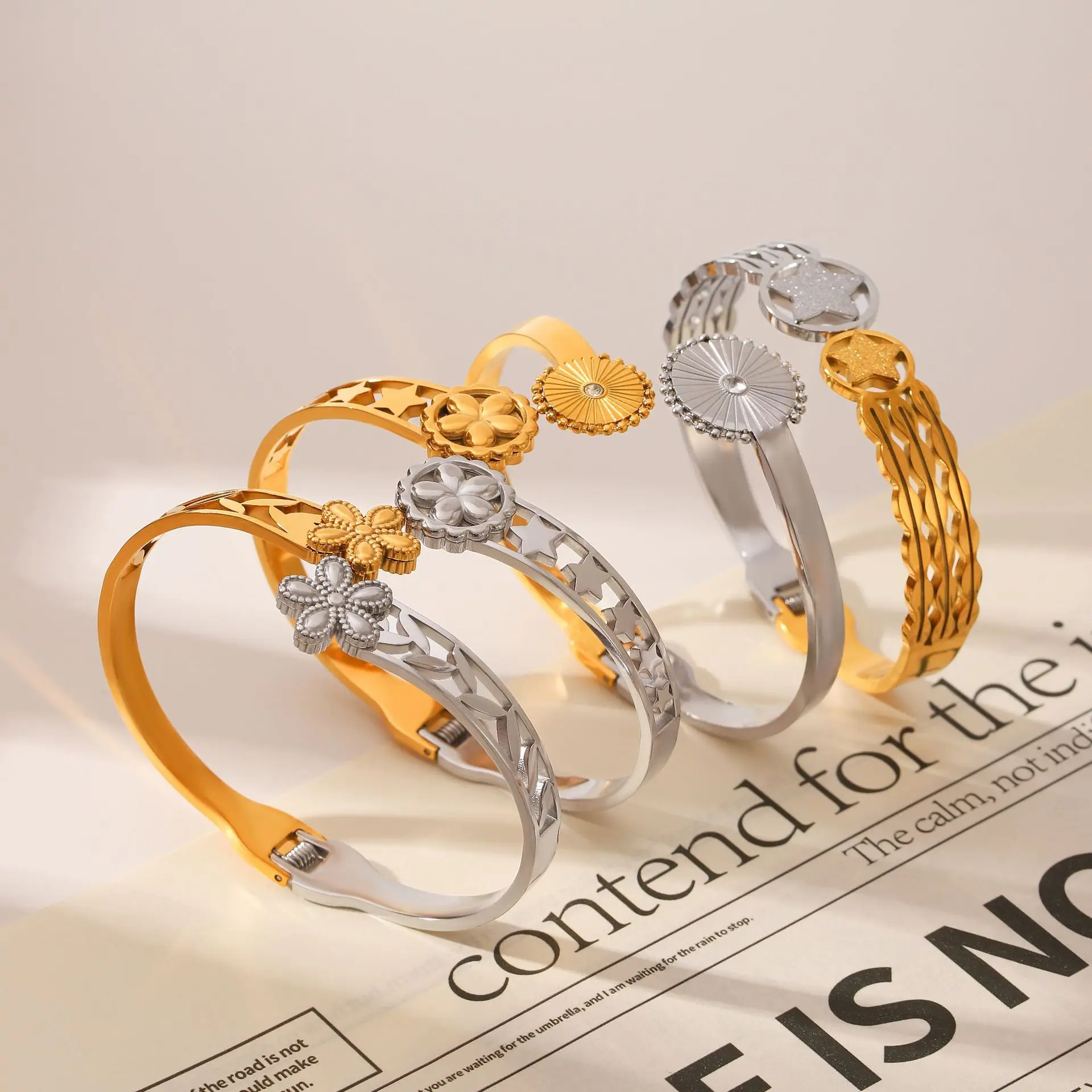 MW Open Hammered Hollow Pentagram Flower Star Stainless Steel 18K Gold Plated Cuff Stainless Steel Bangle Bracelet Women Jewelry