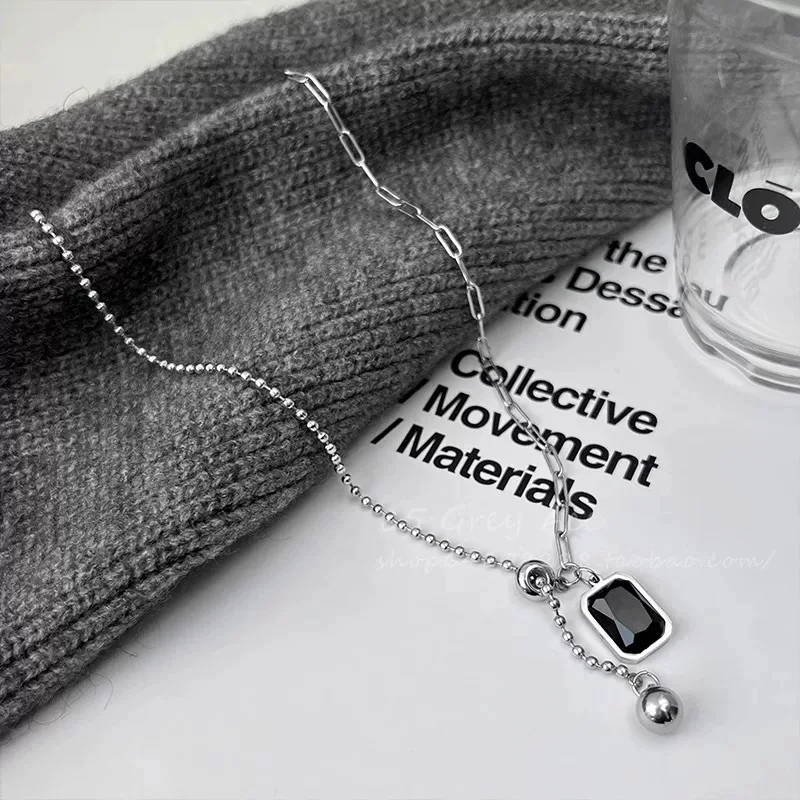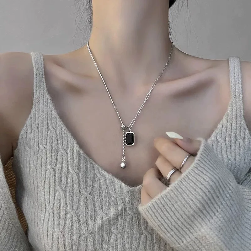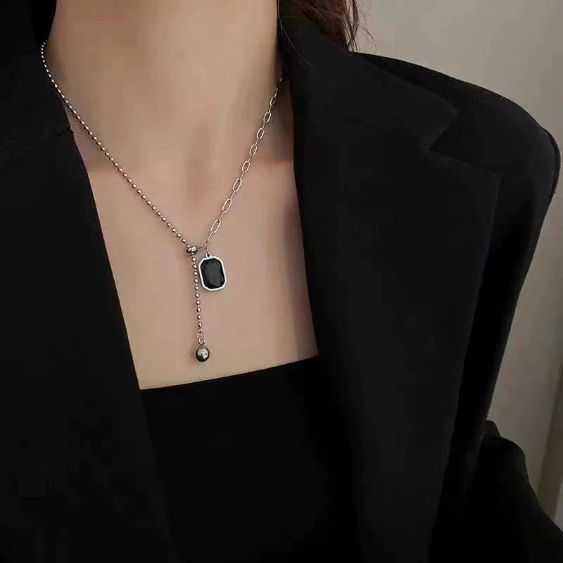 MW Personality Long Women's Black Square Silver Plated Stainless Steel Punk Wedding Pendant Necklace