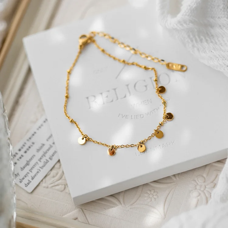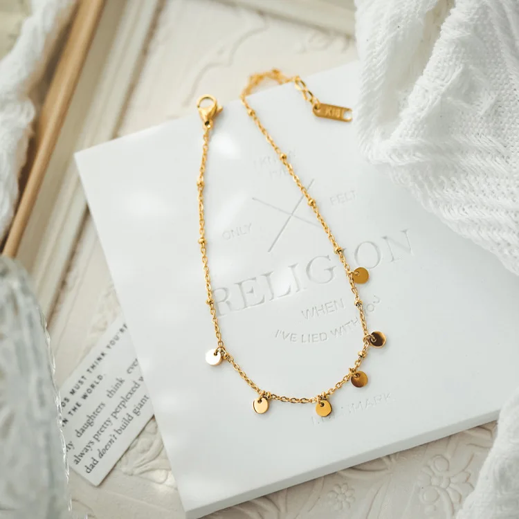 MW 18K Gold Plated Stainless Steel Foot Jewelry for Women Bead Chain Petal Disc Pendant Anklet