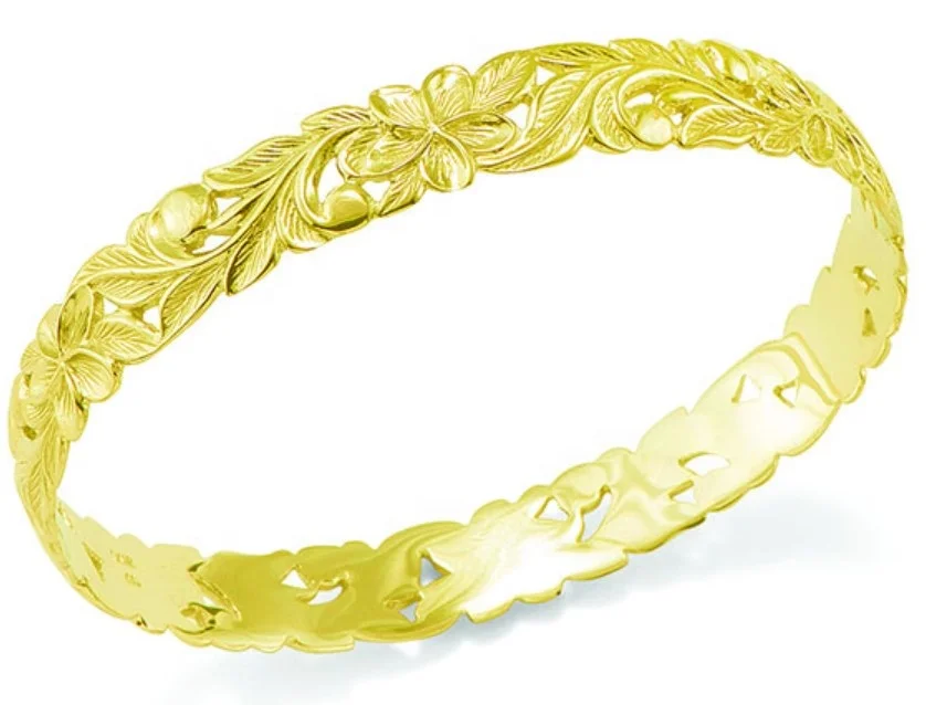 Custom Manufacturer Gold Plated Hawaiian Engraved Plumeria Scroll Bangle