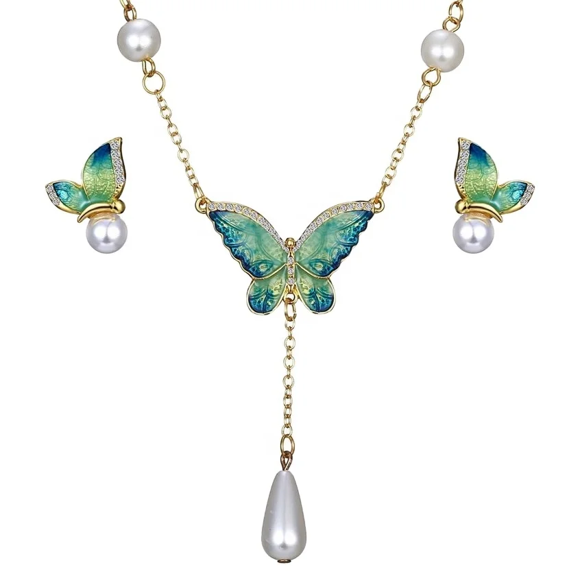 Custom Gold Plated Cz Enamel butterfly Pearl Necklace Earring Set for Women