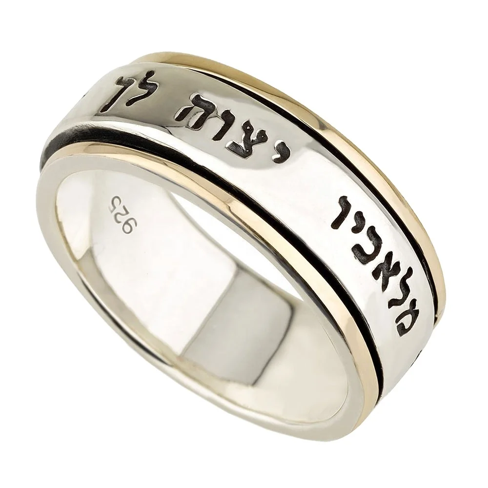 Manufacturer Unique Design Spinning Two-tone Gold Plated Engraved Paslm Hebrew Jerusalem Holy Father Sterling Silver Ring