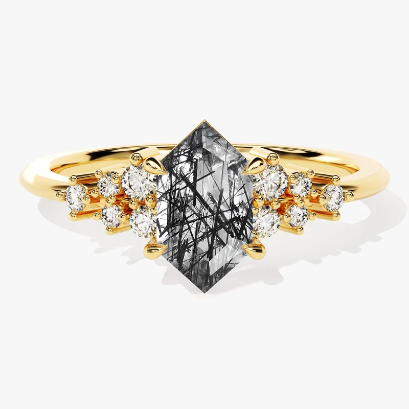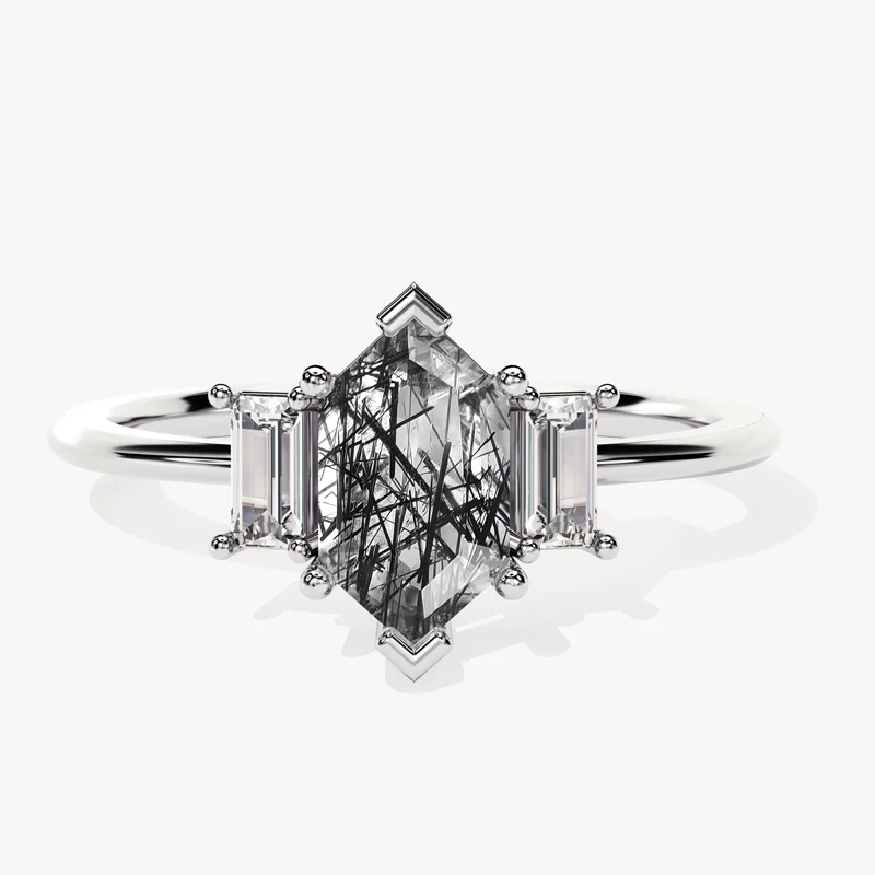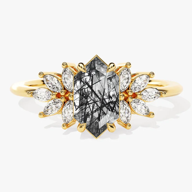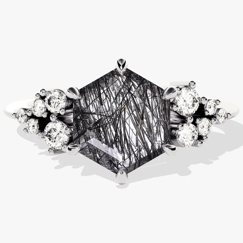 Black Rutilated Quartz Hexagon Cut Ring Tourmalinated Quartz Rose Gold 925 Silver Women Engagement Wedding Fine Custom Jewelry