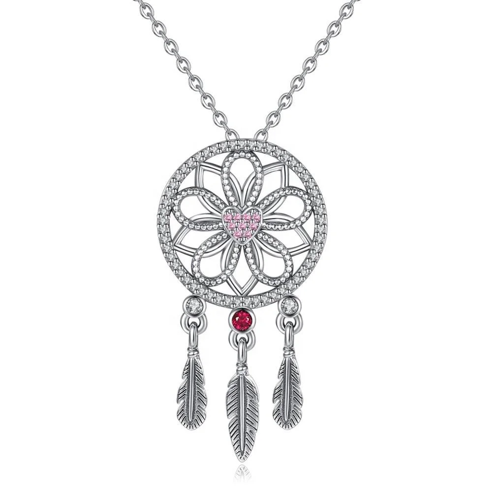Wholesale Custom 925 Sterling Silver Women Feather Dreamcatcher Dream Catcher Charms Pendant Necklace