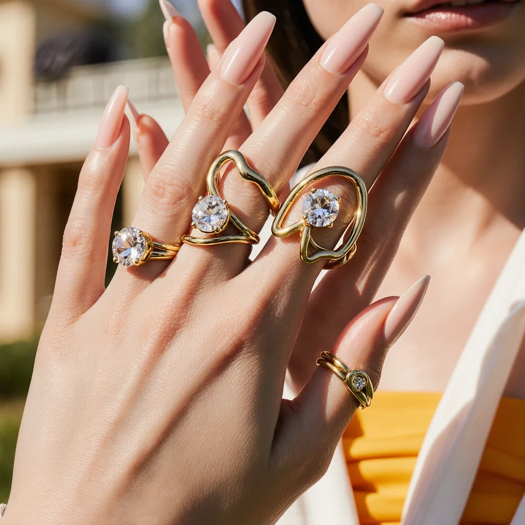 18K Gold Plate Stainless Steel Rings Modern Minimalist Lines Double-layer Hollow Geometric Large Zircon Open Solitaire Ring